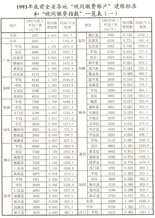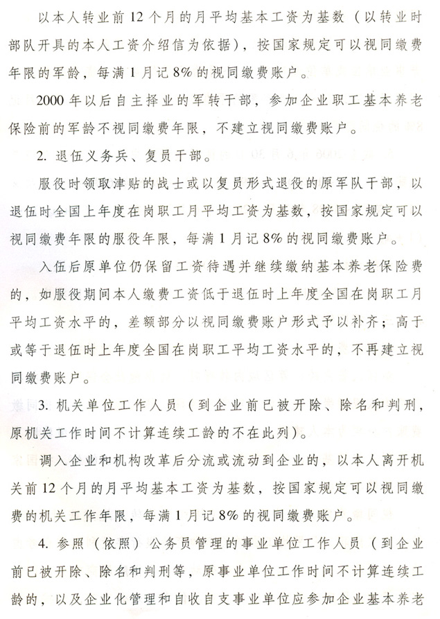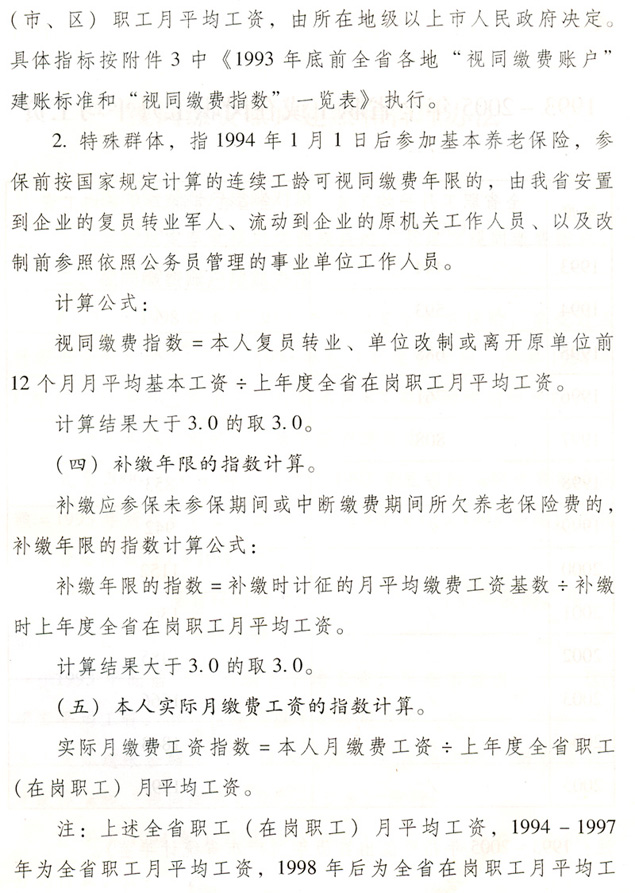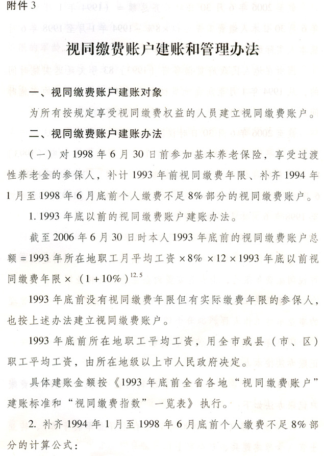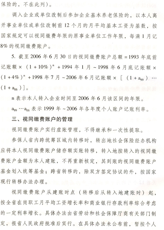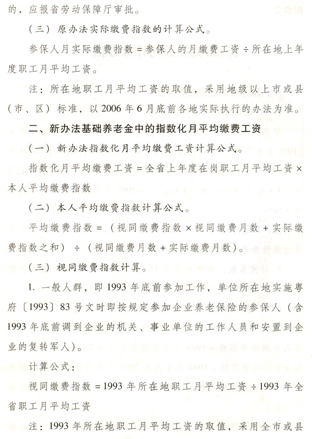 關(guān)于貫徹國務(wù)院完善企業(yè)職工基本 養(yǎng)老保險(xiǎn)制度決定的通知 各地級以上市人民政府,各縣(市、區(qū))人民政府,省政府各部門、各直屬機(jī)構(gòu): 為全面深入貫徹落實(shí)《國務(wù)院關(guān)于完善企業(yè)職工基本養(yǎng)老保險(xiǎn)制度的決定》(國發(fā)〔2005〕38號),進(jìn)一步推進(jìn)廣東省社會保障體系建設(shè),決定自2006年7月1日起調(diào)整完善廣東省企業(yè)職工基本養(yǎng)老保險(xiǎn)制度,現(xiàn)就有關(guān)工作通知如下: 一、調(diào)整個人賬戶記賬規(guī)模 從2006年7月1日起,統(tǒng)一將全省企業(yè)職工基本養(yǎng)老保險(xiǎn)個人賬戶規(guī)模從本人繳費(fèi)工資的11%調(diào)整為8%。2006年6月30日前的個人賬戶與2006年7月1日后的個人賬戶合并計(jì)算。 各地要做好清理審核調(diào)整前后的個人賬戶數(shù)據(jù)和個人賬戶記錄工作,實(shí)現(xiàn)個人賬戶的規(guī)范化管理。 二、調(diào)整養(yǎng)老保險(xiǎn)繳費(fèi)基數(shù) 個人繳費(fèi)以參保人月應(yīng)稅工資、薪金收入為基數(shù)。參保人月應(yīng)稅工資、薪金高于全省上年度在崗職工月平均工資300%的,以全省上年度在崗職工月平均工資的300%為繳費(fèi)基數(shù);參保人月應(yīng)稅工資、薪金收入低于全省上年度在崗職工月平均工資60%的,以全省上年度在崗職工月平均工資的60%為繳費(fèi)基數(shù)。 參保人所在市(地級以上市,下同)上年度在崗職工月平均工資低于全省上年度在崗職工月平均工資,且本人月應(yīng)稅工資、薪金低于全省上年度在崗職工月平均工資60%的,可按不低于所在市上年度在崗職工月平均工資的60%為繳費(fèi)基數(shù),以后逐步過渡到以全省上年度在崗職工月平均工資的60%為繳費(fèi)基數(shù)。 城鎮(zhèn)個體工商戶和靈活就業(yè)人員,原則上以全省上年度在崗職工月平均工資為繳費(fèi)基數(shù)。所在市上年度在崗職工月平均工資低于全省上年度在崗職工月平均工資的,也可從所在市上年度在崗職工月平均工資的60%起步,逐步過渡到全省上年度在崗職工月平均工資。 經(jīng)申報(bào)并已核定的2006年6月底前的繳費(fèi)基數(shù)不再重新核定。 三、改革基本養(yǎng)老金計(jì)發(fā)辦法 從2006年7月1日起,改革企業(yè)基本養(yǎng)老金計(jì)發(fā)辦法。2006年6月30日前已申領(lǐng)基本養(yǎng)老金的參保人,仍按原辦法計(jì)發(fā)基本養(yǎng)老金,同時執(zhí)行本通知規(guī)定的年度調(diào)整辦法。 (一)享受基本養(yǎng)老金的條件。 參保人符合下列條件之一的,可申請按月領(lǐng)取基本養(yǎng)老金: 1.1998年7月1日后參加基本養(yǎng)老保險(xiǎn),達(dá)到國家規(guī)定退休年齡,累計(jì)繳費(fèi)年限(含視同繳費(fèi)年限,下同)滿15年的; 2.1998年6月30日前參加基本養(yǎng)老保險(xiǎn),2013年6月30日前達(dá)到國家規(guī)定的退休年齡,累計(jì)繳費(fèi)年限滿10年的; 3.1998年6月30日前參加基本養(yǎng)老保險(xiǎn),2013年7月1日后達(dá)到國家規(guī)定的退休年齡,累計(jì)繳費(fèi)年限滿15年的; 41998年6月30日前應(yīng)參保未參保,1998年7月1日以后辦理參保補(bǔ)繳手續(xù),達(dá)到國家規(guī)定的退休年齡,累計(jì)繳費(fèi)年限滿15年的。 (二)基本養(yǎng)老金計(jì)發(fā)辦法。 1.1998年7月1日后參加基本養(yǎng)老保險(xiǎn)的參保人,基本養(yǎng)老金由基礎(chǔ)養(yǎng)老金和個人賬戶養(yǎng)老金組成。 ?。?)基礎(chǔ)養(yǎng)老金月標(biāo)準(zhǔn)為: 基礎(chǔ)養(yǎng)老金=(全省上年度在崗職工月平均工資+本人指數(shù)化月平均繳費(fèi)工資)÷2×繳費(fèi)年限(含視同繳費(fèi)年限)×1% 本人指數(shù)化月平均繳費(fèi)工資的計(jì)算辦法見附件2。 參保人指數(shù)化月平均繳費(fèi)工資低于全省上年度在崗職工月平均工資的60%的,基礎(chǔ)養(yǎng)老金月標(biāo)準(zhǔn)為: 基礎(chǔ)養(yǎng)老金=(全省上年度在崗職工月平均工資×a+本人指數(shù)化月平均繳費(fèi)工資)÷2×繳費(fèi)年限(含視同繳費(fèi)年限)×1% a=本人平均繳費(fèi)指數(shù)÷0.6,今后可隨廣東省區(qū)域經(jīng)濟(jì)發(fā)展情況進(jìn)行適當(dāng)調(diào)整。 基礎(chǔ)養(yǎng)老金從基本養(yǎng)老保險(xiǎn)統(tǒng)籌基金中支付。 (2)個人賬戶養(yǎng)老金月標(biāo)準(zhǔn)為: 以本人首次領(lǐng)取基本養(yǎng)老金時個人賬戶儲存額除以計(jì)發(fā)月數(shù),計(jì)發(fā)月數(shù)按國發(fā)〔2005〕38號文的規(guī)定執(zhí)行(見附件1)。個人賬戶養(yǎng)老金從本人個人賬戶基金中支付。 2.具有視同繳費(fèi)權(quán)益并建立了視同繳費(fèi)賬戶的下列參保人,在計(jì)發(fā)基礎(chǔ)養(yǎng)老金和個人賬戶養(yǎng)老金的基礎(chǔ)上,再計(jì)發(fā)過渡性養(yǎng)老金: (1)1998年6月30日前參加基本養(yǎng)老保險(xiǎn),2006年7月1日以后符合按月領(lǐng)取基本養(yǎng)老金條件的; (2)1998年7月1日后參加基本養(yǎng)老保險(xiǎn),參保前具有按國家規(guī)定的視同繳費(fèi)年限,2006年7月1日后符合按月領(lǐng)取基本養(yǎng)老金條件的。 3.首次領(lǐng)取的過渡性養(yǎng)老金月標(biāo)準(zhǔn)為: ?。?)1998年6月30日前參加基本養(yǎng)老保險(xiǎn)的,以首次領(lǐng)取基本養(yǎng)老金時本人視同繳費(fèi)賬戶總額除以120; (2)1998年7月1日后參加基本養(yǎng)