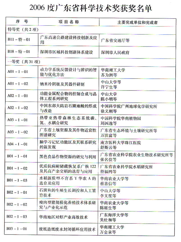 關于頒發(fā)2006年度廣東省科學技術獎的通報 各地級以上市人民政府,各縣(市、區(qū))人民政府,省政府各部門、各直屬機構:根據(jù)《廣東省科學技術獎勵辦法》的規(guī)定,授予“廣東高速公路建設科技創(chuàng)新及應用”和“深圳市區(qū)域科技創(chuàng)新體系建設”兩項科學技術成果廣東省科學技術獎特等獎;授予“動力學系統(tǒng)反饋設計與辨識的智能與優(yōu)化方法”等31項科學技術成果廣東省科學技術獎一等獎;授予“數(shù)值逼近中高精度快速算法及在圖形圖像中的應用”等81項科學技術成果廣東省科學技術獎二等獎;授予“致密天體多波段輻射及周邊環(huán)境物理的研究”等174項科學技術成果廣東省科學技術獎三等獎(獲獎名單附后)。 希望獲獎單位和獲獎者戒驕戒躁,繼續(xù)努力,再攀高峰;希望各地、各部門和廣大科技工作者虛心向獲獎單位和獲獎人員學習,積極進取、刻苦鉆研、求真務實、開拓創(chuàng)新,不斷提高自主創(chuàng)新能力,加快推進科學技術成果的轉化,為進一步推動我省產(chǎn)業(yè)結構優(yōu)化升級,全面提高綜合競爭力,促進經(jīng)濟社會又好又快發(fā)展作出更大貢獻。 附件:2006年度廣東省科學技術獎獲獎名單 廣東省人民政府 二○○七年七月十七日 |
