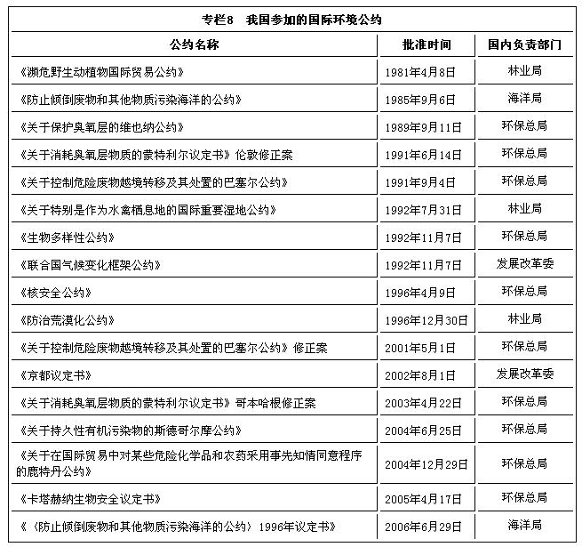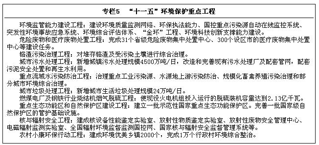 國家環(huán)境保護(hù)“十一五”規(guī)劃 ? 根據(jù)《國民經(jīng)濟和社會發(fā)展“十一五”規(guī)劃綱要》和《國務(wù)院關(guān)于落實科學(xué)發(fā)展觀加強環(huán)境保護(hù)的決定》(國發(fā)〔2005〕39號)編制本規(guī)劃。本規(guī)劃是國家“十一五”規(guī)劃體系的重要組成部分,旨在闡明“十一五”期間國家在環(huán)境保護(hù)領(lǐng)域的目標(biāo)、任務(wù)、投資重點和政策措施,重點明確各級人民政府及環(huán)境保護(hù)部門的責(zé)任和任務(wù),同時引導(dǎo)企業(yè)、動員社會共同參與,努力建設(shè)環(huán)境友好型社會。 一、環(huán)境形勢 ?。ㄒ唬笆濉逼陂g環(huán)境保護(hù)工作取得進(jìn)展。 黨中央、國務(wù)院高度重視環(huán)境保護(hù),將改善環(huán)境質(zhì)量作為落實科學(xué)發(fā)展觀、構(gòu)建社會主義和諧社會的重要內(nèi)容,把環(huán)境保護(hù)作為宏觀經(jīng)濟調(diào)控的重要手段,采取了一系列重大政策措施。各地區(qū)、各有關(guān)部門不斷加大環(huán)境保護(hù)工作力度,淘汰了一批高消耗、高污染的落后生產(chǎn)能力,加快了污染治理和城市環(huán)境基礎(chǔ)設(shè)施建設(shè),重點地區(qū)、流域和城市的環(huán)境治理不斷推進(jìn),生態(tài)保護(hù)和治理得到加強;采取了一系列應(yīng)對氣候變化的對策措施,市場化機制開始進(jìn)入環(huán)境保護(hù)領(lǐng)域,全社會環(huán)境保護(hù)投資比“九五”時期翻了一番,占GDP的比例首次超過1%;環(huán)境管理能力有所提高,環(huán)境執(zhí)法力度有所加強;全社會的環(huán)境意識和人民群眾的參與程度明顯提高,對我國環(huán)境保護(hù)規(guī)律性的認(rèn)識不斷深化。在經(jīng)濟快速發(fā)展,重化工業(yè)迅猛增長的情況下,部分主要污染物排放總量有所減少,環(huán)境污染和生態(tài)破壞加劇的趨勢減緩,部分地區(qū)和城市環(huán)境質(zhì)量有所改善,核與輻射安全得到保證。 ?。ǘ┉h(huán)境形勢依然嚴(yán)峻。 我國環(huán)境保護(hù)雖然取得積極進(jìn)展,但環(huán)境形勢依然嚴(yán)峻?!笆濉杯h(huán)境保護(hù)計劃指標(biāo)沒有全部實現(xiàn),二氧化硫排放量比2000年增加了27.8%,化學(xué)需氧量僅減少2.1%,未完成削減10%的控制目標(biāo)。淮河、海河、遼河、太湖、巢湖、滇池(以下簡稱“三河三湖”)等重點流域和區(qū)域的治理任務(wù)只完成計劃目標(biāo)的60%左右。主要污染物排放量遠(yuǎn)遠(yuǎn)超過環(huán)境容量,環(huán)境污染嚴(yán)重。全國26%的地表水國控(國家重點監(jiān)控)斷面劣于水環(huán)境V類標(biāo)準(zhǔn),62%的斷面達(dá)不到III類標(biāo)準(zhǔn);流經(jīng)城市90%的河段受到不同程度污染,75%的湖泊出現(xiàn)富營養(yǎng)化;30%的重點城市飲用水源地水質(zhì)達(dá)不到III類標(biāo)準(zhǔn);近岸海域環(huán)境質(zhì)量不容樂觀;46%的設(shè)區(qū)城市空氣質(zhì)量達(dá)不到二級標(biāo)準(zhǔn),一些大中城市灰霾天數(shù)有所增加,酸雨污染程度沒有減輕。 全國水力侵蝕面積161萬平方公里,沙化土地174萬平方公里,90%以上的天然草原退化;許多河流的水生態(tài)功能嚴(yán)重失調(diào);生物多樣性減少,外來物種入侵造成的經(jīng)濟損失嚴(yán)重;一些重要的生態(tài)功能區(qū)生態(tài)功能退化。農(nóng)村環(huán)境問題突出,土壤污染日趨嚴(yán)重。危險廢物、汽車尾氣、持久性有機污染物等污染持續(xù)增加。應(yīng)對氣候變化形勢嚴(yán)峻,任務(wù)艱巨。發(fā)達(dá)國家上百年工業(yè)化過程中分階段出現(xiàn)的環(huán)境問題,在我國已經(jīng)集中顯現(xiàn)。我國已進(jìn)入污染事故多發(fā)期和矛盾凸顯期。 “十五”期間力圖解決的一些深層次環(huán)境問題沒有取得突破性進(jìn)展,產(chǎn)業(yè)結(jié)構(gòu)不合理、經(jīng)濟增長方式粗放的狀況沒有根本轉(zhuǎn)變,環(huán)境保護(hù)滯后于經(jīng)濟發(fā)展的局面沒有改變,體制不順、機制不活、投入不足、能力不強的問題仍然突出,有法不依、違法難究、執(zhí)法不嚴(yán)、監(jiān)管不力的現(xiàn)象比較普遍。 “十一五”期間,我國人口在龐大的基數(shù)上還將增加4%,城市化進(jìn)程將加快,經(jīng)濟總量將增長40%以上,經(jīng)濟社會發(fā)展與資源環(huán)境約束的矛盾越來越突出,國際環(huán)境保護(hù)壓力也將加大,環(huán)境保護(hù)面臨越來越嚴(yán)峻的挑戰(zhàn)。 (三)環(huán)境保護(hù)工作進(jìn)入新階段。 黨中央、國務(wù)院把環(huán)境保護(hù)擺上了更加重要的戰(zhàn)略位置,落實科學(xué)發(fā)展觀、構(gòu)建社會主義和諧社會為做好環(huán)保工作提供了根本保證,環(huán)境保護(hù)面臨前所未有的機遇。經(jīng)濟增長方式轉(zhuǎn)變和經(jīng)濟結(jié)構(gòu)調(diào)整步伐加快,將為解決結(jié)構(gòu)性、區(qū)域性環(huán)境污染和生態(tài)破壞起到基礎(chǔ)性作用。綜合國力增強為環(huán)境保護(hù)提供了更有力的物質(zhì)和技術(shù)支撐。經(jīng)濟體制和行政管理體制改革深化,為創(chuàng)新環(huán)保工作體制和機制提供了有利的條件。廣大群眾環(huán)境意識普遍提高,為環(huán)境保護(hù)提供了強大的動力。我國環(huán)境與發(fā)展的關(guān)系正在發(fā)生重大變化,環(huán)境保