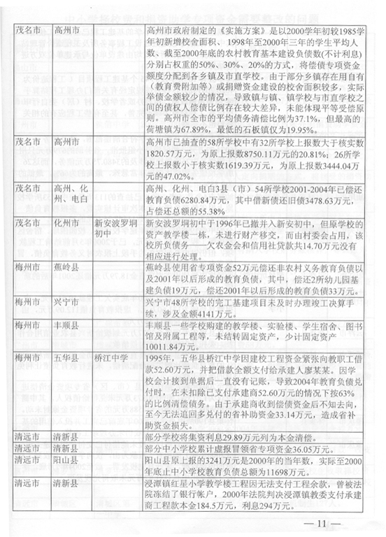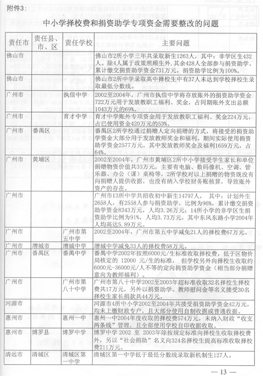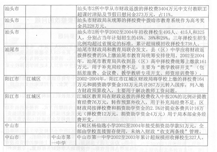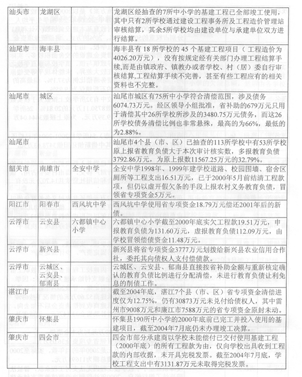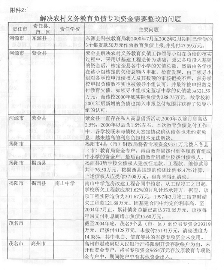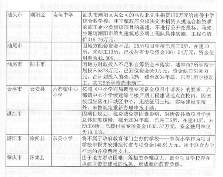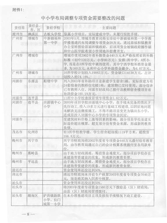 (省教育廳 2005年12月14日) 2004年8月至2005年3月,省審計(jì)廳組織各級審計(jì)機(jī)關(guān)對省解決農(nóng)村義務(wù)教育負(fù)債專項(xiàng)資金、2002至2004年中小學(xué)布局調(diào)整專項(xiàng)資金和66所城市公辦中小學(xué)校捐資助學(xué)資金進(jìn)行了專項(xiàng)審計(jì)調(diào)查。審計(jì)發(fā)現(xiàn),部分地方償還農(nóng)村義務(wù)教育負(fù)債工作進(jìn)展緩慢,資金使用效益不高、效果不佳;有些地區(qū)教育資金管理不嚴(yán),使用不符合規(guī)定。為進(jìn)一步加強(qiáng)教育資金管理,整改存在的問題,查處違紀(jì)違規(guī)行為,預(yù)防類似情況發(fā)生,提高資金使用效益,根據(jù)省委、省政府領(lǐng)導(dǎo)同志批示精神,提出如下意見。 一、切實(shí)加強(qiáng)領(lǐng)導(dǎo),嚴(yán)肅糾正教育資金管理違紀(jì)違規(guī)問題 對省審計(jì)廳《關(guān)于解決農(nóng)村義務(wù)教育負(fù)債專項(xiàng)資金的審計(jì)調(diào)查報(bào)告》(粵審行〔2005〕97號)、《關(guān)于2002-2004年度中小學(xué)布局調(diào)整專項(xiàng)資金的審計(jì)調(diào)查報(bào)告》(粵審行〔2005〕98號)和《關(guān)于66所城市公辦中小學(xué)校2002-2004年度擇校費(fèi)和捐資助學(xué)專項(xiàng)資金的審計(jì)綜合報(bào)告》(粵審行〔2005〕99號)反映的情況和問題,以及所提出的有關(guān)整改事項(xiàng)(附后),各地級以上市政府要高度重視,加強(qiáng)領(lǐng)導(dǎo),切實(shí)組織教育、財(cái)政、監(jiān)察、審計(jì)等部門抓好整改。對擠占挪用、虛報(bào)冒領(lǐng)、超范圍使用專項(xiàng)資金等違紀(jì)違規(guī)行為,要切實(shí)糾正,逐筆追回違規(guī)使用的資金,并按照有關(guān)規(guī)定對相關(guān)責(zé)任人進(jìn)行處理。各有關(guān)市政府必須在2006年2月中旬前將本地區(qū)整改情況報(bào)省教育廳,省教育廳會同省財(cái)政廳、監(jiān)察廳、審計(jì)廳審核后報(bào)省政府,并向省人大常委會作專題報(bào)告。對沒有采取措施整改或整改不力的,省將按有關(guān)規(guī)定追究相關(guān)人員的責(zé)任,并予以通報(bào)或通過新聞媒體曝光。 二、采取積極措施,加大中小學(xué)布局調(diào)整和農(nóng)村義務(wù)教育負(fù)債償還工作的力度 各地要采取切實(shí)有效措施,加快中小學(xué)布局調(diào)整項(xiàng)目學(xué)校的立項(xiàng)、征地、報(bào)建、招標(biāo)等工作,參照老區(qū)山區(qū)小學(xué)危房改造的優(yōu)惠政策,支持中小學(xué)布局調(diào)整項(xiàng)目學(xué)校的建設(shè)。要改革和完善中小學(xué)布局調(diào)整專項(xiàng)資金集中支付辦法和項(xiàng)目學(xué)校審定辦法,簡政放權(quán),提高效率。2005至2007年中小學(xué)布局調(diào)整資金省補(bǔ)助學(xué)校的名單,由各地級以上市教育局、財(cái)政局報(bào)省教育廳、財(cái)政廳核定后報(bào)省政府備案。各地級以上市財(cái)政部門可以根據(jù)本地區(qū)的實(shí)際情況,調(diào)整2005至2007年中小學(xué)布局調(diào)整資金集中支付辦法,由地級以上市財(cái)政部門集中支付改為縣(市、區(qū))財(cái)政部門集中支付。2004年以前下達(dá)的布局調(diào)整專項(xiàng)資金和建設(shè)任務(wù),各地級以上市要在2006年上半年以前完成并作階段性總結(jié)。各地級以上市要全面檢查解決農(nóng)村義務(wù)教育負(fù)債的工作,并按照《解決農(nóng)村義務(wù)教育負(fù)債責(zé)任書》的要求,在2006年2月中旬前將省補(bǔ)助資金的償還項(xiàng)目、償還債務(wù)人和償還金額列表以書面形式報(bào)送省財(cái)政廳、教育廳。尚未使用省補(bǔ)助資金的縣(市、區(qū)),必須在2006年3月底前將資金撥付使用完畢。2006年3月底前未使用的資金,省財(cái)政廳、教育廳、審計(jì)廳將聯(lián)合進(jìn)行專項(xiàng)審計(jì)調(diào)查,進(jìn)一步核實(shí)省補(bǔ)助資金滯留情況,并根據(jù)審計(jì)調(diào)查結(jié)果,在2006年度省一般轉(zhuǎn)移支付款項(xiàng)中扣回滯留金額。 三、進(jìn)一步加強(qiáng)教育資金監(jiān)管,切實(shí)防止發(fā)生類似問題 (一)完善省教育專項(xiàng)資金管理和監(jiān)督辦法。為確保省級教育專項(xiàng)資金及時到位、??顚S煤吞岣咝б妫≈备饔嘘P(guān)部門要加強(qiáng)溝通,密切合作。省教育廳加強(qiáng)省教育專項(xiàng)資金的規(guī)劃,實(shí)施期兩年以上的專項(xiàng)資金要一次規(guī)劃,分期實(shí)施,建立資金項(xiàng)目庫,并與省財(cái)政廳制訂和完善專項(xiàng)資金管理辦法;省財(cái)政廳會同省教育廳組織實(shí)施省級教育專項(xiàng)資金績效評價工作;省審計(jì)廳、教育廳建立完善省級教育專項(xiàng)資金定期審計(jì)制度;各級監(jiān)察機(jī)關(guān)加強(qiáng)監(jiān)督檢查,嚴(yán)肅查處違紀(jì)違規(guī)問題,落實(shí)責(zé)任追究制度。各級教育部門要加強(qiáng)教育系統(tǒng)內(nèi)部審計(jì)和監(jiān)督,發(fā)現(xiàn)問題要及時糾正和處理。各地要完善教育經(jīng)費(fèi)投入和管理機(jī)制,確保省各項(xiàng)補(bǔ)助資金及時到位和??顚S?。2006年上半年前,各地要對近3年來省財(cái)政安排的各項(xiàng)教育專項(xiàng)資金(包括農(nóng)村稅費(fèi)改革轉(zhuǎn)移支付用于教育的補(bǔ)助資金)進(jìn)行全面清理和檢查,嚴(yán)肅