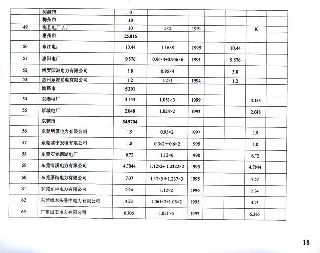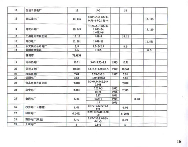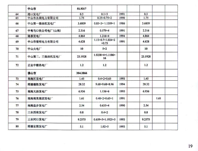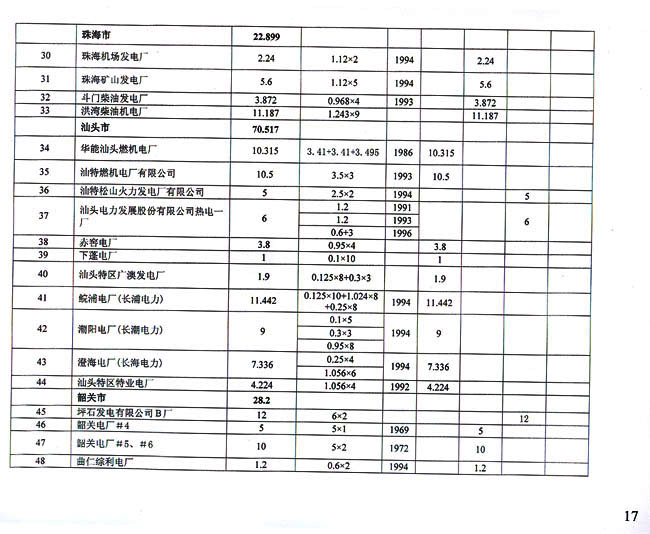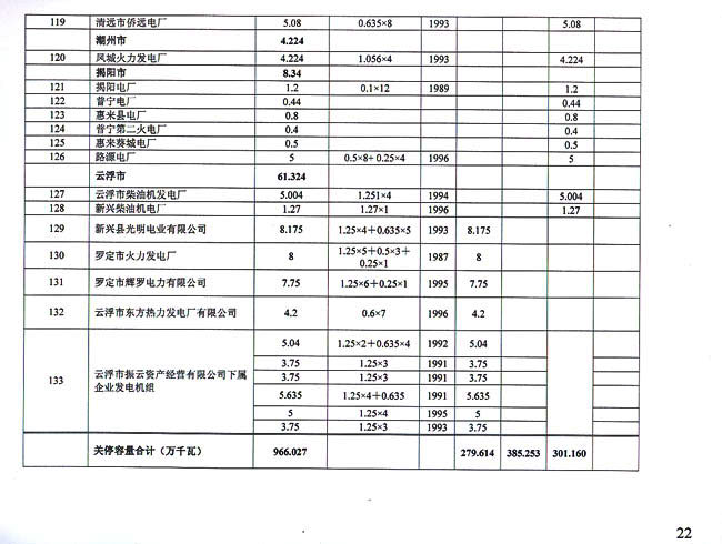 注:本表所列關(guān)停機(jī)組包括四個(gè)部分:一是國(guó)家發(fā)展改革委與省政府簽訂的廣東省“十一五”期間關(guān)停小火電機(jī)組責(zé)任書(shū)中的機(jī)組。經(jīng)進(jìn)一步核實(shí),該責(zé)任書(shū)中,中山小欖發(fā)電廠與中山市菊明電力有限公司系同一項(xiàng)目;永寧發(fā)電廠與中山市永潤(rùn)電力有限公司系同一項(xiàng)目;江門(mén)發(fā)電廠與江門(mén)柴油機(jī)廠系同一項(xiàng)目,屬重復(fù)計(jì)算。鑒此,本表中相應(yīng)剔除了前者,共計(jì)調(diào)減容量8.38萬(wàn)千瓦。二是補(bǔ)列已經(jīng)納入“上大壓小”電源項(xiàng)目配套關(guān)停但未列入責(zé)任書(shū)的中山市正業(yè)中糖熱電廠1.2萬(wàn)千瓦。三是核實(shí)機(jī)組銘牌容量后調(diào)增容量4.3萬(wàn)千瓦。四是根據(jù)佛山市、省粵電集團(tuán)公司提出增加關(guān)停小火電機(jī)組規(guī)模、相應(yīng)實(shí)施“上大壓小”電源項(xiàng)目建設(shè)的要求,增加關(guān)停佛山市的佛山沙口發(fā)電廠28.36萬(wàn)千瓦、佛山城西發(fā)電廠11.14萬(wàn)千瓦;茂名市的茂名熱電廠#1、#3、#4號(hào)機(jī)(3×10萬(wàn)千瓦),合計(jì)增加容量69.5萬(wàn)千瓦。經(jīng)上述調(diào)整之后,全省“十一五”期間關(guān)?;痣姍C(jī)組總?cè)萘繛?66萬(wàn)千瓦。