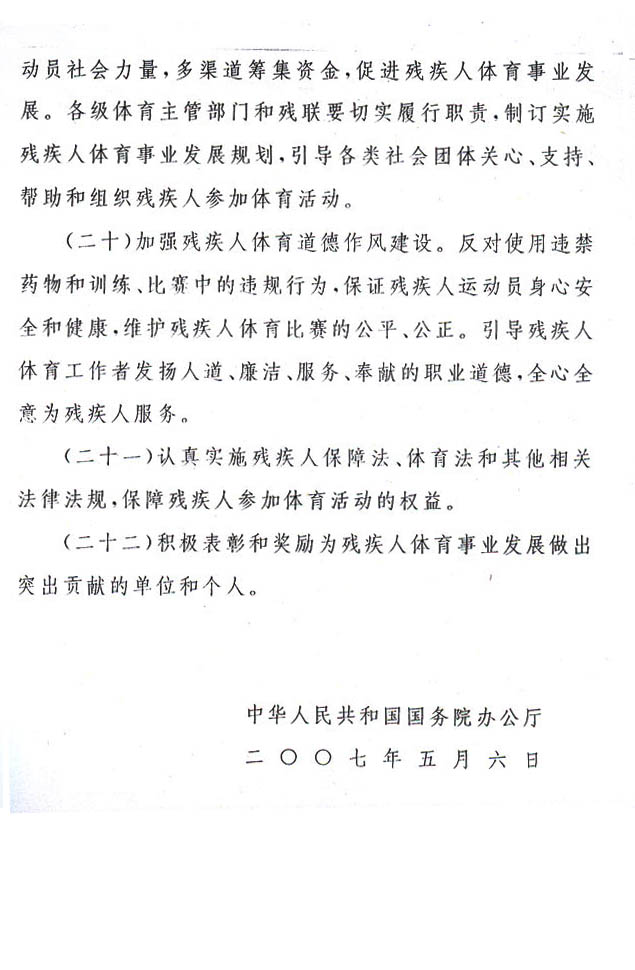 現(xiàn)將《國(guó)務(wù)院辦公廳關(guān)于進(jìn)一步加強(qiáng)殘疾人體育工作的意見(jiàn)》(國(guó)辦發(fā)〔2007〕31號(hào))轉(zhuǎn)發(fā)給你們,請(qǐng)認(rèn)真貫徹執(zhí)行。