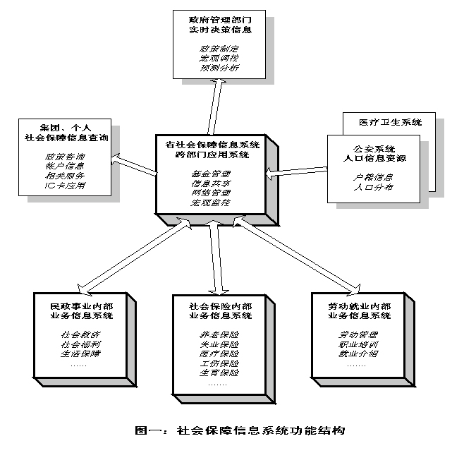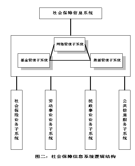 ?。ǘ┫到y(tǒng)邏輯結(jié)構(gòu) 社會(huì)保障信息系統(tǒng)在縱向上有省、地市和縣三級(jí),橫向上在省、地市級(jí)是以 基金管理子系統(tǒng)、網(wǎng)絡(luò)管理子系統(tǒng)、數(shù)據(jù)管理子系統(tǒng)為核心,并與三大業(yè)務(wù)系統(tǒng) 相連接。另外,還有面向社會(huì)公共信息服務(wù)子系統(tǒng)。在縣級(jí)重點(diǎn)是建設(shè)各個(gè)業(yè)務(wù) 子系統(tǒng),并通過(guò)網(wǎng)絡(luò)中心與地市級(jí)連接。系統(tǒng)的邏輯結(jié)構(gòu)如圖二所示。 |