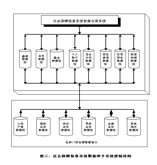 ?。ㄈ┫到y(tǒng)數(shù)據(jù)倉(cāng)庫(kù) 社會(huì)保障信息系統(tǒng)數(shù)據(jù)倉(cāng)庫(kù)是一個(gè)統(tǒng)一的、綜合的、分布式的大型數(shù)據(jù)倉(cāng)庫(kù), 它主要包括基礎(chǔ)數(shù)據(jù)庫(kù)、社會(huì)保障業(yè)務(wù)數(shù)據(jù)庫(kù)、基金數(shù)據(jù)庫(kù)、個(gè)人帳戶數(shù)據(jù)庫(kù)、 綜合分析數(shù)據(jù)庫(kù)、查詢數(shù)據(jù)庫(kù)、宏觀數(shù)據(jù)庫(kù)、政策法規(guī)等八大數(shù)據(jù)庫(kù)系統(tǒng)。數(shù)據(jù) 倉(cāng)庫(kù)系統(tǒng)構(gòu)成如圖三所示。 |