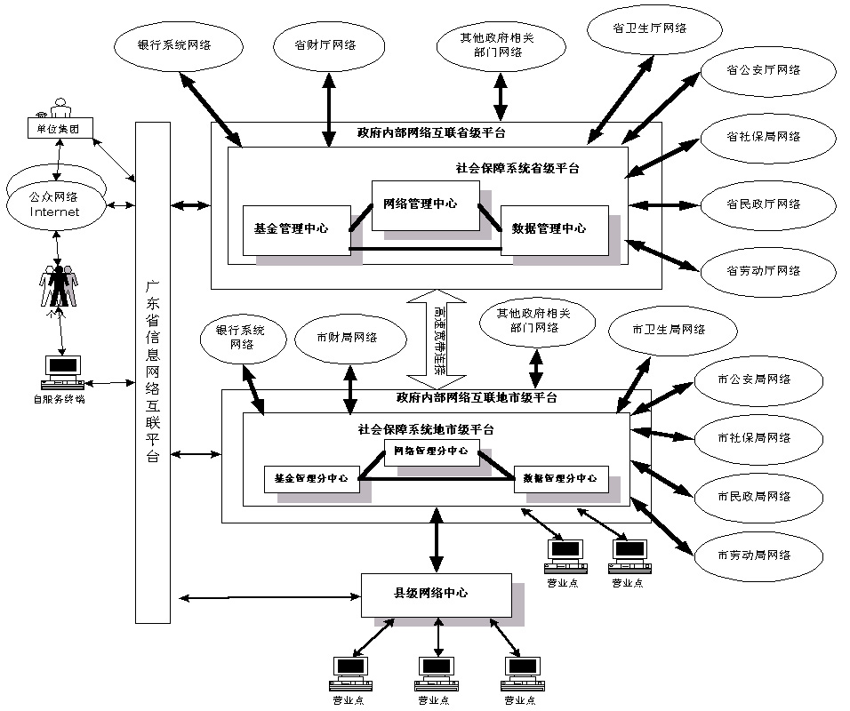 ?。ㄋ模┫到y(tǒng)網(wǎng)絡(luò)結(jié)構(gòu) 社會(huì)保障信息系統(tǒng)的網(wǎng)絡(luò)以我省建立的全省統(tǒng)一網(wǎng)絡(luò)互聯(lián)大平臺(tái)為基礎(chǔ),在 省、市級(jí)分別以政府信息網(wǎng)絡(luò)平臺(tái)為核心,通過(guò)公共通信設(shè)施連接到各有關(guān)部門。 在公共服務(wù)方面,充分利用各個(gè)公眾信息網(wǎng)絡(luò)和INTERNET資源。網(wǎng)絡(luò)結(jié) 構(gòu)如圖四所示。 |