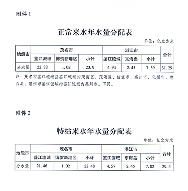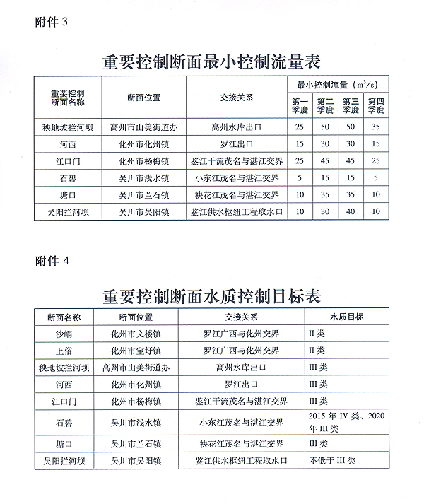 (三)分配總體要求。在確保河道內(nèi)生態(tài)基本需水、全面節(jié)水和充分利用非常規(guī)水源的前提下,以廣東省境內(nèi)鑒江流域水資源可分配量為對象,按照防洪、供水、發(fā)電的順序優(yōu)化水庫、梯級群調(diào)度,確定正常來水年(來水保證率90%以下)和特枯來水年(來水保證率在90%-95%之間,不含90%)情況下茂名和湛江兩市取水量分配指標(biāo);以落實水資源分配方案、協(xié)調(diào)河道內(nèi)外用水、保障供水安全為目標(biāo),確定重要控制斷面最小下泄流量指標(biāo);以水功能區(qū)水質(zhì)達標(biāo)為目的,確定各控制斷面水質(zhì)管理控制指標(biāo)。