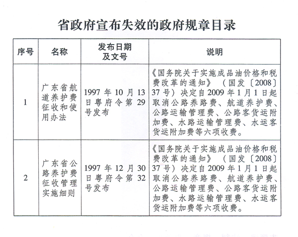 經(jīng)2010年12月7日廣東省人民政府第十一屆65次常務會議通過,決定對《廣東省航道養(yǎng)護費征收和使用辦法》等兩項政府規(guī)章予以宣布失效,現(xiàn)予公布,自公布之日起施行。