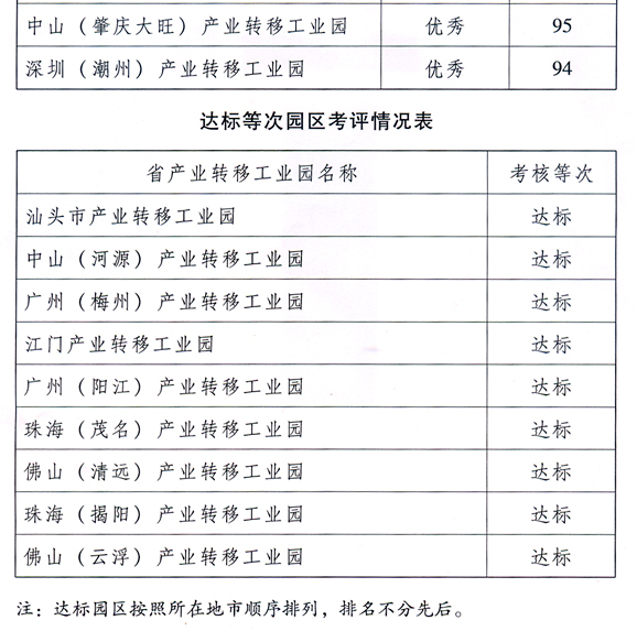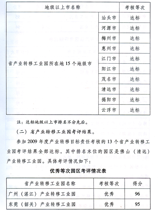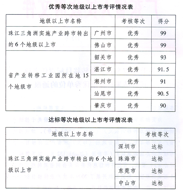 各地級以上市人民政府,省政府各部門、各直屬機構(gòu): 為貫徹落實《中共廣東省委廣東省人民政府關(guān)于推進產(chǎn)業(yè)轉(zhuǎn)移和勞動力轉(zhuǎn)移的決定》(粵發(fā)〔2008〕4號),加快推進我省產(chǎn)業(yè)轉(zhuǎn)移工作,按照省政府《印發(fā)廣東省產(chǎn)業(yè)轉(zhuǎn)移目標責(zé)任考核評價辦法的通知》(粵府函〔2010〕132號,以下簡稱《考評辦法》)要求,省經(jīng)濟和信息化委牽頭會同省雙轉(zhuǎn)移工作領(lǐng)導(dǎo)小組成員單位,共同組織開展了2009年度產(chǎn)業(yè)轉(zhuǎn)移目標責(zé)任考核評價工作。現(xiàn)將考核評價結(jié)果進行通報,并對獲得優(yōu)秀等次的地級以上市政府和省產(chǎn)業(yè)轉(zhuǎn)移工業(yè)園予以表彰。 一、產(chǎn)業(yè)轉(zhuǎn)移目標責(zé)任考核評價結(jié)果 (一)各地級以上市政府考評結(jié)果。 全省21個地級以上市2009年度產(chǎn)業(yè)轉(zhuǎn)移目標責(zé)任考核結(jié)果全部達標,具體考評情況如下: ? 根據(jù)《考評辦法》有關(guān)規(guī)定,特對評定為優(yōu)秀等次的廣州、佛山、韶關(guān)、湛江、潮州、汕尾、肇慶等7個地級以上市政府和廣州(湛江)產(chǎn)業(yè)轉(zhuǎn)移工業(yè)園、東莞(韶關(guān))產(chǎn)業(yè)轉(zhuǎn)移工業(yè)園、中山(肇慶大旺)產(chǎn)業(yè)轉(zhuǎn)移工業(yè)園、深圳(潮州)產(chǎn)業(yè)轉(zhuǎn)移工業(yè)園等4個省產(chǎn)業(yè)轉(zhuǎn)移工業(yè)園予以全省通報表彰。 二、考評結(jié)果分析 ?。ㄒ唬┊a(chǎn)業(yè)轉(zhuǎn)移工作取得初步成效。 1.各地各園區(qū)產(chǎn)業(yè)轉(zhuǎn)移工作體制機制進一步完善。 各地級以上市政府均建立了較為完善的產(chǎn)業(yè)轉(zhuǎn)移體制機制、政策措施到位、組織管理得力,省產(chǎn)業(yè)轉(zhuǎn)移工業(yè)園組織管理工作進一步完善。本次考評中政策措施類的考核指標中,僅少數(shù)地級以上市政府在資金安排計劃、項目引進計劃等指標上被扣分;考核的13個省產(chǎn)業(yè)轉(zhuǎn)移工業(yè)園組織管理類的指標均得到滿分14分。 2.珠三角地級以上市合作共建力度進一步加強。 一是珠三角各市均已派員(政府副秘書長或處級以上干部)到合作共建省產(chǎn)業(yè)轉(zhuǎn)移示范園所在地政府或園區(qū)任職或掛職,參與園區(qū)管理。二是合作共建資金支持力度加大。珠三角各市落實的2009年度共建資金均已達到或超過《關(guān)于抓好產(chǎn)業(yè)轉(zhuǎn)移園建設(shè)加快產(chǎn)業(yè)轉(zhuǎn)移步伐的意見》(粵府〔2009〕54號)要求的1億元。三是合作招商工作得到加強。2009年珠三角各市與合作共建方共聯(lián)合舉辦了30多場次規(guī)模較大的招商引資會和招商考察活動。四是推動大型工業(yè)項目及項目組團轉(zhuǎn)移入園工作取得進展。2009年珠三角地區(qū)共推動4個投資10億元以上的大型工業(yè)項目或項目組團進入省產(chǎn)業(yè)轉(zhuǎn)移工業(yè)園,對園區(qū)產(chǎn)業(yè)發(fā)展產(chǎn)生了深遠影響。 3.對產(chǎn)業(yè)轉(zhuǎn)移工作的認識進一步提高。 一是珠三角地區(qū)對產(chǎn)業(yè)轉(zhuǎn)移的認識不斷提高,推動產(chǎn)業(yè)轉(zhuǎn)移的積極性也不斷增強。除按規(guī)定落實產(chǎn)業(yè)轉(zhuǎn)移工作機構(gòu)、專項工作經(jīng)費、共建省產(chǎn)業(yè)轉(zhuǎn)移示范園的資金投入外,一些市還主動設(shè)立本市產(chǎn)業(yè)轉(zhuǎn)移獎勵資金,如佛山市2009年安排了2000萬元用于獎勵本地企業(yè)向合作共建的省級產(chǎn)業(yè)轉(zhuǎn)移工業(yè)園轉(zhuǎn)移。二是欠發(fā)達地區(qū)和省產(chǎn)業(yè)轉(zhuǎn)移工業(yè)園科學(xué)發(fā)展的意識有所提高。各市逐漸從招商引資向招商選資轉(zhuǎn)變,注重對園區(qū)發(fā)展進行科學(xué)規(guī)劃,提高了轉(zhuǎn)移項目的準入門檻,同時堅持產(chǎn)業(yè)集聚和節(jié)約集約利用土地,積極打造產(chǎn)業(yè)集群。從考評的情況看,各市省產(chǎn)業(yè)轉(zhuǎn)移工業(yè)園新增單位生產(chǎn)總值(GDP)消耗新增建設(shè)用地均低于所在市平均水平,考評的13個省產(chǎn)業(yè)轉(zhuǎn)移示范園中,在園建成項目全部符合用地、建筑容積率、綠地率、建筑密度、投資強度、單位面積稅收等方面的規(guī)劃要求,并按要求通過環(huán)評,園區(qū)污水處理設(shè)施及管網(wǎng)建設(shè)也明顯加快。三是省產(chǎn)業(yè)轉(zhuǎn)移園產(chǎn)業(yè)集聚發(fā)展意識不斷提高。13個省產(chǎn)業(yè)轉(zhuǎn)移示范性園中,主導(dǎo)產(chǎn)業(yè)產(chǎn)值占園區(qū)產(chǎn)值的比例全部超過了50%,其中10個園區(qū)每畝土地面積產(chǎn)出工業(yè)增加值達到了60萬元以上。 4.產(chǎn)業(yè)轉(zhuǎn)移工作效果進一步顯現(xiàn)。 從珠三角產(chǎn)業(yè)轉(zhuǎn)出市看,一是注重利用產(chǎn)業(yè)轉(zhuǎn)移推動產(chǎn)業(yè)轉(zhuǎn)型升級。如,廣州市利用部分工業(yè)企業(yè)退出后的廠區(qū)建設(shè)33個創(chuàng)意產(chǎn)業(yè)園,每年可實現(xiàn)產(chǎn)值120億元;佛山市南莊鎮(zhèn)通過轉(zhuǎn)移陶瓷生產(chǎn)企業(yè),逐步形成陶機制造、陶瓷研發(fā)、商貿(mào)會展、總部基地等多種形態(tài)并存的產(chǎn)業(yè)發(fā)展新格局,陶瓷產(chǎn)業(yè)產(chǎn)值不降反升,同時也一舉摘掉了污染帽子,成為環(huán)