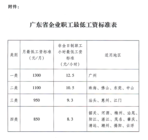 關(guān)于調(diào)整我省企業(yè)職工最低工資標準的通知 ? 各地級以上市人民政府,省政府各部門、各直屬機構(gòu): 根據(jù)《中華人民共和國勞動法》、《最低工資規(guī)定》(原勞動保障部令第21號),以及我省經(jīng)濟社會發(fā)展狀況,為充分發(fā)揮最低工資標準的保障作用,提高低收入職工的收入水平,促進社會和諧發(fā)展和幸福廣東建設(shè),現(xiàn)決定對我省企業(yè)職工最低工資標準進行調(diào)整。有關(guān)事項通知如下: 一、從2011年3月1日起,調(diào)整我省企業(yè)職工最低工資標準和非全日制職工小時最低工資標準(具體標準和適用地區(qū)見附件,深圳市按《深圳市員工工資支付條例》執(zhí)行)。 各地級以上市原則上應(yīng)統(tǒng)一執(zhí)行省確定的標準,有條件的地區(qū)可在省確定的標準上適當上調(diào),并報省人力資源和社會保障廳備案。 二、各地級以上市政府應(yīng)在本通知下發(fā)之日起15日內(nèi),向社會公布本地區(qū)的最低工資標準。 三、各地要嚴格執(zhí)行最低工資保障制度,加大對提高最低工資標準的宣傳,加強檢查監(jiān)督,切實保障廣大職工的合法權(quán)益。 ? 附件:廣東省企業(yè)職工最低工資標準表 ? ? ? 廣東省人民政府 二○一一年一月十八日 ? ? |