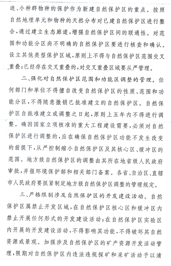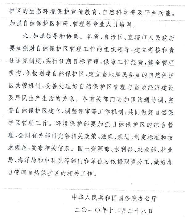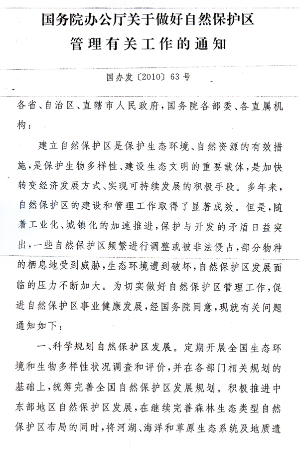 轉(zhuǎn)發(fā)國務(wù)院辦公廳關(guān)于做好自然保護(hù)區(qū) 管理有關(guān)工作的通知 ? 各地級以上市人民政府,各縣(市、區(qū))人民政府,省政府各部門、各直屬機(jī)構(gòu): 現(xiàn)將《國務(wù)院辦公廳關(guān)于做好自然保護(hù)區(qū)管理有關(guān)工作的通知》(國辦發(fā)〔2010〕63號)轉(zhuǎn)發(fā)給你們,請認(rèn)真貫徹執(zhí)行。 近年來,在各地、各有關(guān)部門的共同努力下,我省自然保護(hù)區(qū)建設(shè)工作取得顯著成績,全省共建成自然保護(hù)區(qū)360個(gè),其中,國家級11個(gè)、省級66個(gè),自然保護(hù)區(qū)數(shù)量居全國首位,為建設(shè)“綠色廣東”和環(huán)境友好型社會(huì)發(fā)揮了重要作用。但一些地區(qū)自然保護(hù)區(qū)也存在重申報(bào)輕保護(hù)、重建設(shè)輕管理和地方級自然保護(hù)區(qū)調(diào)整程序不規(guī)范等問題。省人民政府要求,各地、各有關(guān)部門要按照國辦發(fā)〔2010〕63號文的部署和要求,進(jìn)一步加強(qiáng)自然保護(hù)區(qū)建設(shè)管理工作,提升自然保護(hù)區(qū)管理和保護(hù)水平,為加快轉(zhuǎn)型升級、建設(shè)幸福廣東提供生態(tài)環(huán)境保障。 我省地方級自然保護(hù)區(qū)調(diào)整管理規(guī)定另行印發(fā)。 ? ? ? 廣東省人民政府辦公廳 二○一一年二月十四日 ? ? ?