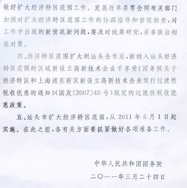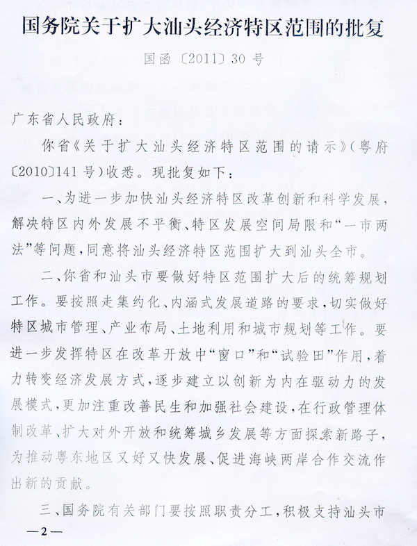 轉(zhuǎn)發(fā)國(guó)務(wù)院關(guān)于擴(kuò)大汕頭經(jīng)濟(jì)特區(qū) 范圍批復(fù)的通知 ? 汕頭市人民政府,省發(fā)展改革委: 現(xiàn)將《國(guó)務(wù)院關(guān)于擴(kuò)大汕頭經(jīng)濟(jì)特區(qū)范圍的批復(fù)》(國(guó)函〔2011〕30號(hào))轉(zhuǎn)發(fā)給你們,請(qǐng)遵照?qǐng)?zhí)行。 ? ? ? ? 廣東省人民政府二○一一年四月十一日 ? ? ? ? ? |
