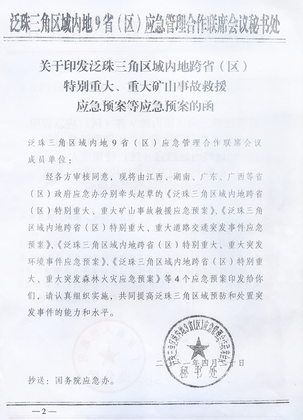 ? 轉(zhuǎn)發(fā)泛珠三角區(qū)域內(nèi)地9?。▍^(qū))應(yīng)急管理 合作聯(lián)席會議秘書處關(guān)于印發(fā)泛珠三角 區(qū)域內(nèi)地跨省(區(qū))特別重大、 重大礦山事故救援應(yīng)急預(yù)案 等應(yīng)急預(yù)案的函的通知 ? 韶關(guān)、河源、梅州、湛江、茂名、肇慶、清遠、潮州、云浮市人民政府,省應(yīng)急委成員單位: 根據(jù)省政府領(lǐng)導(dǎo)同志意見,現(xiàn)將泛珠三角區(qū)域內(nèi)地9省(區(qū))應(yīng)急管理合作聯(lián)席會議秘書處《關(guān)于印發(fā)泛珠三角區(qū)域內(nèi)地跨?。▍^(qū))特別重大、重大礦山事故救援應(yīng)急預(yù)案等應(yīng)急預(yù)案的函》轉(zhuǎn)發(fā)給你們,請結(jié)合《廣東省突發(fā)事件應(yīng)對條例》有關(guān)規(guī)定,抓好貫徹落實。執(zhí)行中遇到的問題,請徑與省政府應(yīng)急辦聯(lián)系。 ? ? ? 廣東省人民政府辦公廳 二○一一年四月二十五日 ? ? ? ? ? ? ? ? ? ? ? ? ? ? ? ? ? ? ? ? ? ? ? ? ? ? ? ? ? ? ? ? ? ? ? ? ? ? ? ? ? ? ? ? ? ? ? |