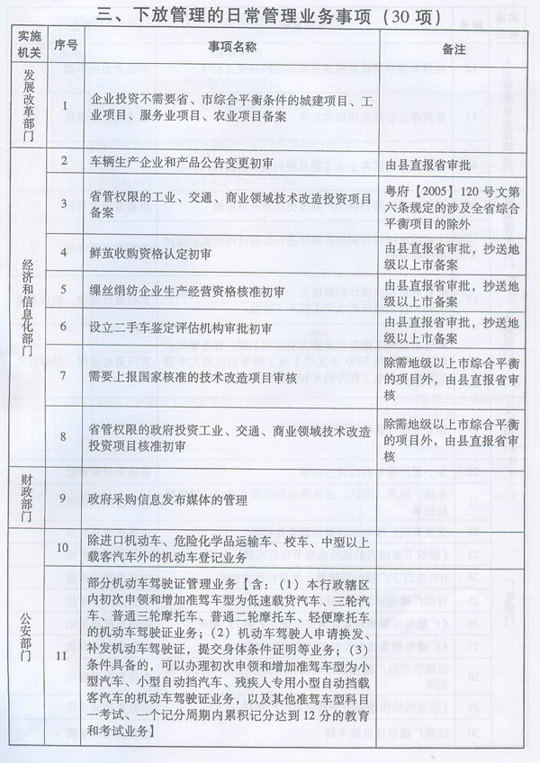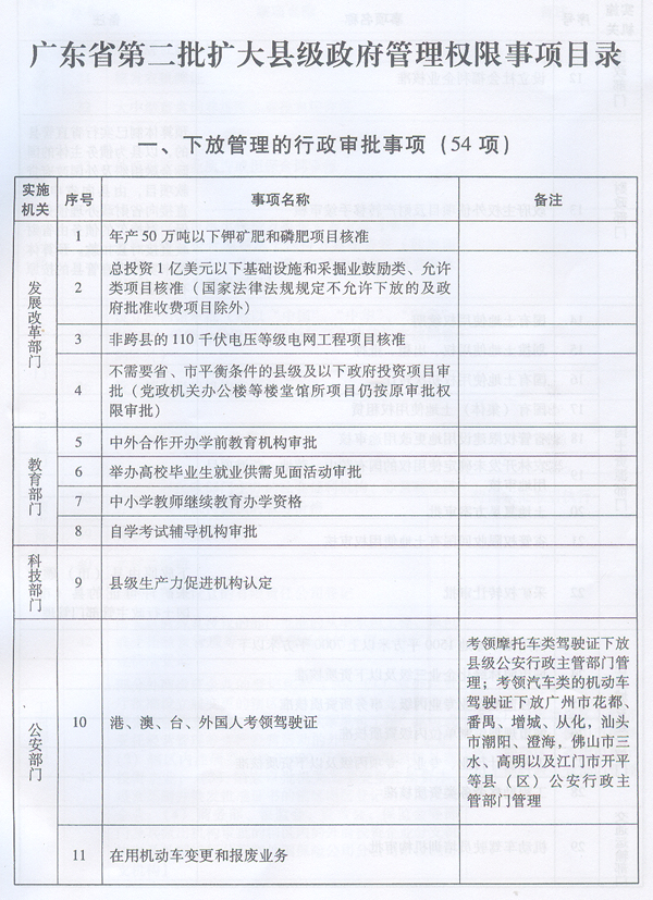 《廣東省第二批擴大縣級政府管理權(quán)限事項目錄》業(yè)經(jīng)2011年5月27日廣東省人民政府第十一屆73次常務(wù)會議通過,現(xiàn)予公布,自公布之日起施行。