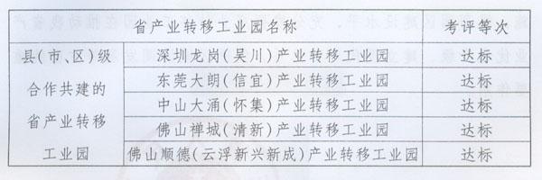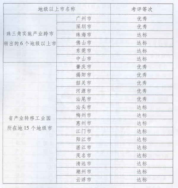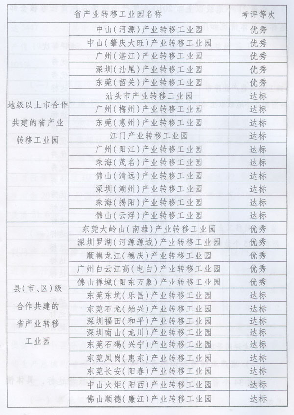 關(guān)于2010年度產(chǎn)業(yè)轉(zhuǎn)移目標(biāo) 責(zé)任考評(píng)情況的通報(bào) ? 各地級(jí)以上市人民政府,省政府各部門、各直屬機(jī)構(gòu): 為貫徹落實(shí)《中共廣東省委廣東省人民政府關(guān)于推進(jìn)產(chǎn)業(yè)轉(zhuǎn)移和勞動(dòng)力轉(zhuǎn)移的決定》(粵發(fā)〔2008〕4號(hào)),加快推進(jìn)我省產(chǎn)業(yè)轉(zhuǎn)移工作,按照省政府《印發(fā)廣東省產(chǎn)業(yè)轉(zhuǎn)移目標(biāo)責(zé)任考核評(píng)價(jià)辦法的通知》(粵府函〔2010〕132號(hào),以下簡(jiǎn)稱《考評(píng)辦法》)要求,省經(jīng)濟(jì)和信息化委會(huì)同省雙轉(zhuǎn)移工作領(lǐng)導(dǎo)小組成員單位,共同組織開展了2010年度產(chǎn)業(yè)轉(zhuǎn)移目標(biāo)責(zé)任考核評(píng)價(jià)工作?,F(xiàn)將考評(píng)情況通報(bào)如下: 一、2010年度全省產(chǎn)業(yè)轉(zhuǎn)移工作取得顯著成效 ?。ㄒ唬┙?jīng)濟(jì)規(guī)模不斷發(fā)展壯大。截至2010年底,全省34個(gè)省產(chǎn)業(yè)轉(zhuǎn)移工業(yè)園入園項(xiàng)目(包括意向項(xiàng)目)達(dá)2423個(gè),總投資額達(dá)5447億元,其中已建成1196個(gè),投資額1181.6億元。全年實(shí)現(xiàn)產(chǎn)值1953.6億元、稅收108.85億元,同比分別增長(zhǎng)115.4%和105%。 (二)區(qū)域經(jīng)濟(jì)帶動(dòng)作用持續(xù)增強(qiáng)。2010年,省產(chǎn)業(yè)轉(zhuǎn)移工業(yè)園實(shí)現(xiàn)工業(yè)增加值479億元,同比增長(zhǎng)40.3%,占粵東西北地區(qū)工業(yè)增加值的13.5%。15個(gè)產(chǎn)業(yè)轉(zhuǎn)入地級(jí)市中,8個(gè)地級(jí)市園區(qū)工業(yè)增加值占全市比重超過(guò)10%,6個(gè)地級(jí)市比重達(dá)到或接近20%。 (三)引進(jìn)項(xiàng)目質(zhì)量顯著提高。2010年,省產(chǎn)業(yè)轉(zhuǎn)移工業(yè)園引進(jìn)投資額超過(guò)10億元的大型項(xiàng)目和項(xiàng)目組團(tuán)達(dá)42個(gè),比2009年增加20個(gè);入園單個(gè)項(xiàng)目平均投資額達(dá)2.25億元,比2009年提高21.6%。 (四)珠三角地區(qū)“騰籠換鳥”成效顯現(xiàn)。珠三角各市充分利用產(chǎn)業(yè)轉(zhuǎn)移騰出的發(fā)展空間,形成了各具特色的以產(chǎn)業(yè)轉(zhuǎn)移促進(jìn)轉(zhuǎn)型升級(jí)的模式,使現(xiàn)代服務(wù)業(yè)、高技術(shù)制造業(yè)、先進(jìn)制造業(yè)占地區(qū)生產(chǎn)總值的比重不斷上升。2010年,珠三角6個(gè)產(chǎn)業(yè)轉(zhuǎn)出市的先進(jìn)制造業(yè)產(chǎn)值占地區(qū)生產(chǎn)總值的比重比2009年提高2.2個(gè)百分點(diǎn),高技術(shù)制造業(yè)產(chǎn)值占地區(qū)生產(chǎn)總值的比重比2009年提高0.9個(gè)百分點(diǎn)(其中東莞市高出5.1個(gè)百分點(diǎn))。有關(guān)市人均生產(chǎn)總值的增速與地區(qū)生產(chǎn)總值的增速差距不斷縮小。 二、考評(píng)結(jié)果 (一)各地級(jí)以上市政府考評(píng)結(jié)果。 全省21個(gè)地級(jí)以上市2010年度產(chǎn)業(yè)轉(zhuǎn)移目標(biāo)責(zé)任考核全部達(dá)標(biāo),具體情況如下: 注:考評(píng)同等次的地級(jí)以上市排名不分先后。 (二)省產(chǎn)業(yè)轉(zhuǎn)移工業(yè)園考評(píng)結(jié)果。 全省34個(gè)省產(chǎn)業(yè)轉(zhuǎn)移工業(yè)園目標(biāo)責(zé)任考核均達(dá)標(biāo),具體情況如下: ? 注:考評(píng)同等次的園區(qū)按照所在地級(jí)以上市順序排列,排名不分先后。 根據(jù)《考評(píng)辦法》有關(guān)規(guī)定,特對(duì)評(píng)定為優(yōu)秀等次的廣州、深圳、肇慶、揭陽(yáng)、河源、韶關(guān)、汕尾等7個(gè)地級(jí)以上市政府和中山(河源)產(chǎn)業(yè)轉(zhuǎn)移工業(yè)園、中山(肇慶大旺)產(chǎn)業(yè)轉(zhuǎn)移工業(yè)園、廣州(湛江)產(chǎn)業(yè)轉(zhuǎn)移工業(yè)園、深圳(汕尾)產(chǎn)業(yè)轉(zhuǎn)移工業(yè)園、東莞(韶關(guān))產(chǎn)業(yè)轉(zhuǎn)移工業(yè)園、東莞大嶺山(南雄)產(chǎn)業(yè)轉(zhuǎn)移工業(yè)園、深圳羅湖(河源源城)產(chǎn)業(yè)轉(zhuǎn)移工業(yè)園、順德龍江(德慶)產(chǎn)業(yè)轉(zhuǎn)移工業(yè)園、廣州白云江高(電白)產(chǎn)業(yè)轉(zhuǎn)移工業(yè)園、佛山禪城(陽(yáng)東萬(wàn)象)產(chǎn)業(yè)轉(zhuǎn)移工業(yè)園等10個(gè)園區(qū)予以全省通報(bào)表彰,并按照有關(guān)規(guī)定給予相應(yīng)獎(jiǎng)勵(lì)。根據(jù)《廣東省產(chǎn)業(yè)轉(zhuǎn)移工業(yè)園升降級(jí)暫行辦法》(粵辦函〔2011〕187號(hào))有關(guān)規(guī)定,對(duì)考評(píng)排名靠后的珠海(茂名)產(chǎn)業(yè)轉(zhuǎn)移工業(yè)園、深圳南山(龍川)產(chǎn)業(yè)轉(zhuǎn)移工業(yè)園、東莞東坑(樂(lè)昌)產(chǎn)業(yè)轉(zhuǎn)移工業(yè)園等3個(gè)園區(qū)予以黃牌警告。 希望受表彰和獎(jiǎng)勵(lì)的市以及省產(chǎn)業(yè)轉(zhuǎn)移工業(yè)園,再接再厲,銳意進(jìn)取,為全省深入實(shí)施雙轉(zhuǎn)移戰(zhàn)略發(fā)揮示范作用;受黃牌警告的園區(qū)要認(rèn)真分析查找原因,針對(duì)存在問(wèn)題,采取切實(shí)有效措施,提高園區(qū)建設(shè)水平,充分發(fā)揮產(chǎn)業(yè)轉(zhuǎn)移工業(yè)園在推動(dòng)我省產(chǎn)業(yè)優(yōu)化升級(jí)、建立現(xiàn)代產(chǎn)業(yè)體系、促進(jìn)區(qū)域協(xié)調(diào)發(fā)展等方面的重要作用。 ? ? ? ? 廣東省人民政府二○一一年八月