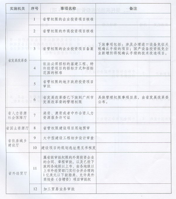 《廣東省第一批調(diào)整由中新廣州知識城管理委員會實施的省級管理權(quán)限事項目錄》已經(jīng)2011年8月2日廣東省人民政府第十一屆77次常務(wù)會議通過,現(xiàn)予公布,自公布之日起施行。