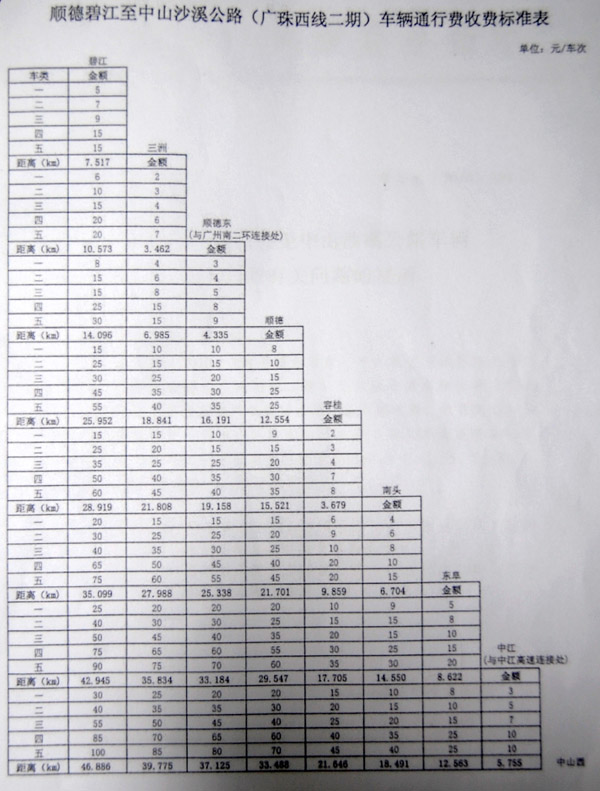 省交通運輸廳、物價局: 粵交費〔2010〕358號請示收悉。省人民政府同意順德碧江至中山沙溪公路(廣珠西線二期)交工驗收通車和收費站收費設(shè)施經(jīng)驗收符合省聯(lián)網(wǎng)收費技術(shù)要求后開始收費,收費車型按全省高速公路統(tǒng)一標(biāo)準(zhǔn),即按車輛軸(輪)數(shù)及車頭高度等物理參數(shù)進行分類,一至五類車收費系數(shù)分別是1、1.5、2、3、3.5;收費標(biāo)準(zhǔn)為0.6元/標(biāo)準(zhǔn)車公里。 ? 附件:1.順德碧江至中山沙溪公路(廣珠西線二期)收費車輛車型分類標(biāo)準(zhǔn)及收費系數(shù)表 2.順德碧江至中山沙溪公路(廣珠西線二期)車輛通行費收費標(biāo)準(zhǔn)表