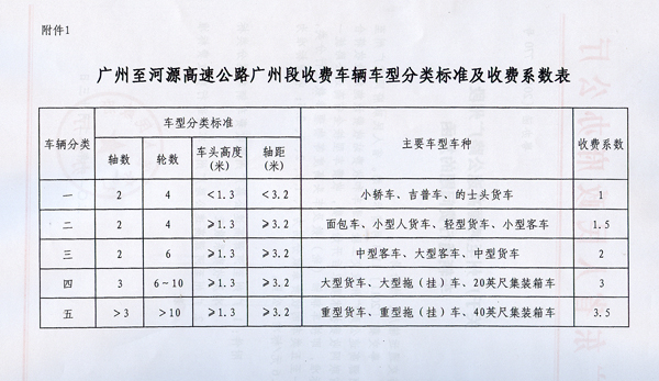 省交通運(yùn)輸廳、物價(jià)局: 粵交費(fèi)〔2011〕1123號(hào)請(qǐng)示收悉。省人民政府同意廣州至河源高速公路廣州段交工驗(yàn)收通車和收費(fèi)站收費(fèi)設(shè)施經(jīng)驗(yàn)收符合省聯(lián)網(wǎng)收費(fèi)技術(shù)要求后開始收費(fèi),收費(fèi)車型按全省高速公路統(tǒng)一標(biāo)準(zhǔn),即按車輛軸(輪)數(shù)及車頭高度等物理參數(shù)進(jìn)行分類,一至五類車的收費(fèi)系數(shù)分別為1、15、2、3、35;收費(fèi)標(biāo)準(zhǔn)為0.6元/標(biāo)準(zhǔn)車公里。 ? 附件:1.廣州至河源高速公路廣州段收費(fèi)車輛車型分類標(biāo)準(zhǔn)及收費(fèi)系數(shù)表 2.廣州至河源高速公路廣州段車輛通行費(fèi)收費(fèi)標(biāo)準(zhǔn)表 廣東省人民政府辦公廳 二○一一年十二月十三日