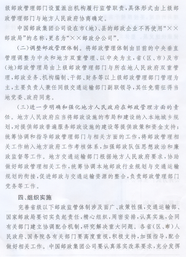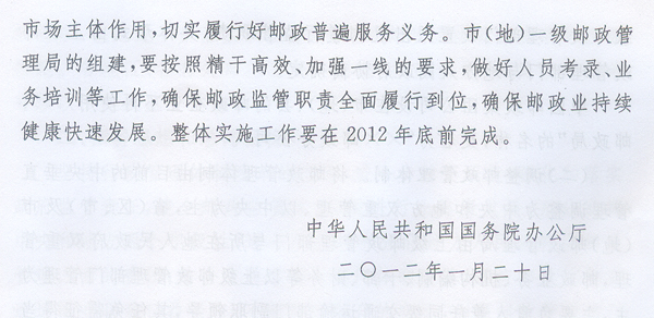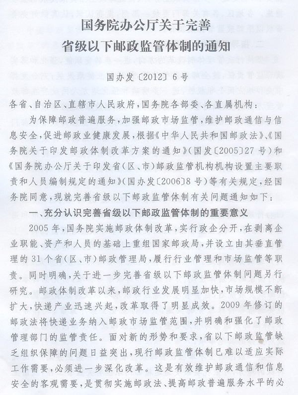轉(zhuǎn)發(fā)國務(wù)院辦公廳關(guān)于完善省級以下 ? 各地級以上市人民政府,各縣(市、區(qū))人民政府,省政府各部門、各直屬機(jī)構(gòu): 現(xiàn)將《國務(wù)院辦公廳關(guān)于完善省級以下郵政監(jiān)管體制的通知》(國辦發(fā)〔2012〕6號)轉(zhuǎn)發(fā)給你們,請認(rèn)真貫徹執(zhí)行。完善省級以下郵政監(jiān)管體制對于深化郵政體制改革,加強(qiáng)行業(yè)規(guī)范管理,優(yōu)化行業(yè)發(fā)展環(huán)境,健全行業(yè)市場機(jī)制,提升郵政普遍服務(wù)和民生服務(wù)水平具有重要意義。省人民政府要求,各地、各有關(guān)部門要按照國務(wù)院的統(tǒng)一部署,全力支持配合做好此項改革工作。省郵政管理局要抓緊牽頭制訂我省完善郵政監(jiān)管體制具體實施方案并認(rèn)真組織實施。 ? ? 廣東省人民政府辦公廳 二○一二年三月十三日 ?