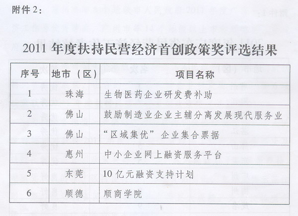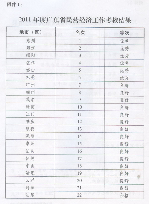 ? 廣東省人民政府辦公廳關(guān)于2011年度 廣東省民營(yíng)經(jīng)濟(jì)工作考核及扶持民營(yíng)經(jīng)濟(jì) 首創(chuàng)政策獎(jiǎng)評(píng)選結(jié)果的通報(bào) ? 各地級(jí)以上市人民政府,順德區(qū)人民政府,省政府各部門(mén)、各直屬機(jī)構(gòu): 按照《中共廣東省委廣東省人民政府關(guān)于促進(jìn)民營(yíng)經(jīng)濟(jì)發(fā)展上水平的意見(jiàn)》(粵發(fā)〔2010〕16號(hào))要求,省經(jīng)濟(jì)和信息化委會(huì)同省促進(jìn)民營(yíng)經(jīng)濟(jì)發(fā)展聯(lián)席會(huì)議成員單位對(duì)各地級(jí)以上市和順德區(qū)人民政府2011年度民營(yíng)經(jīng)濟(jì)工作進(jìn)行了考核,并對(duì)扶持民營(yíng)經(jīng)濟(jì)首創(chuàng)政策獎(jiǎng)進(jìn)行了評(píng)選,現(xiàn)就考核及評(píng)選結(jié)果通報(bào)如下:一、惠州市等6個(gè)地級(jí)市人民政府2011年度廣東省民營(yíng)經(jīng)濟(jì)工作為優(yōu)秀等次,廣州市等14個(gè)地級(jí)以上市和順德區(qū)人民政府為良好等次,汕尾市人民政府為合格等次(見(jiàn)附件1)。 二、珠海市等4個(gè)地級(jí)市和順德區(qū)人民政府積極探索創(chuàng)新扶持民營(yíng)經(jīng)濟(jì)政策,出臺(tái)的“生物醫(yī)藥企業(yè)研發(fā)費(fèi)補(bǔ)助”等6項(xiàng)政策獲得2011年度扶持民營(yíng)經(jīng)濟(jì)首創(chuàng)政策獎(jiǎng)(見(jiàn)附件2)。 為鼓勵(lì)各地進(jìn)一步搞好民營(yíng)經(jīng)濟(jì)的積極性和創(chuàng)造性,省人民政府決定對(duì)獲得2011年度廣東省民營(yíng)經(jīng)濟(jì)工作考核優(yōu)秀等次及扶持民營(yíng)經(jīng)濟(jì)首創(chuàng)政策獎(jiǎng)的有關(guān)市、區(qū)人民政府予以通報(bào)表?yè)P(yáng)。希望受表?yè)P(yáng)的市、區(qū)再接再厲,不斷開(kāi)拓創(chuàng)新,充分發(fā)揮示范作用,努力推動(dòng)我省民營(yíng)經(jīng)濟(jì)工作取得更大成績(jī),為加快轉(zhuǎn)型升級(jí)、建設(shè)幸福廣東作出更大貢獻(xiàn)! ? 附件:1.2011年度廣東省民營(yíng)經(jīng)濟(jì)工作考核結(jié)果 2.2011年度扶持民營(yíng)經(jīng)濟(jì)首創(chuàng)政策獎(jiǎng)評(píng)選結(jié)果 ? ? ? ? 廣東省人民政府辦公廳 2012年9月28日 ? ? ? ?