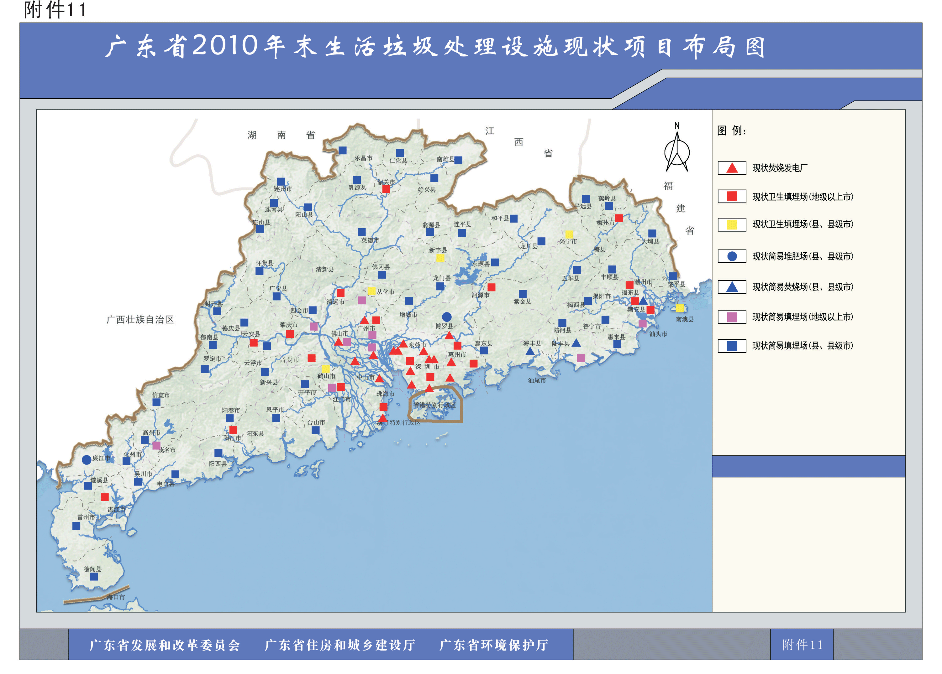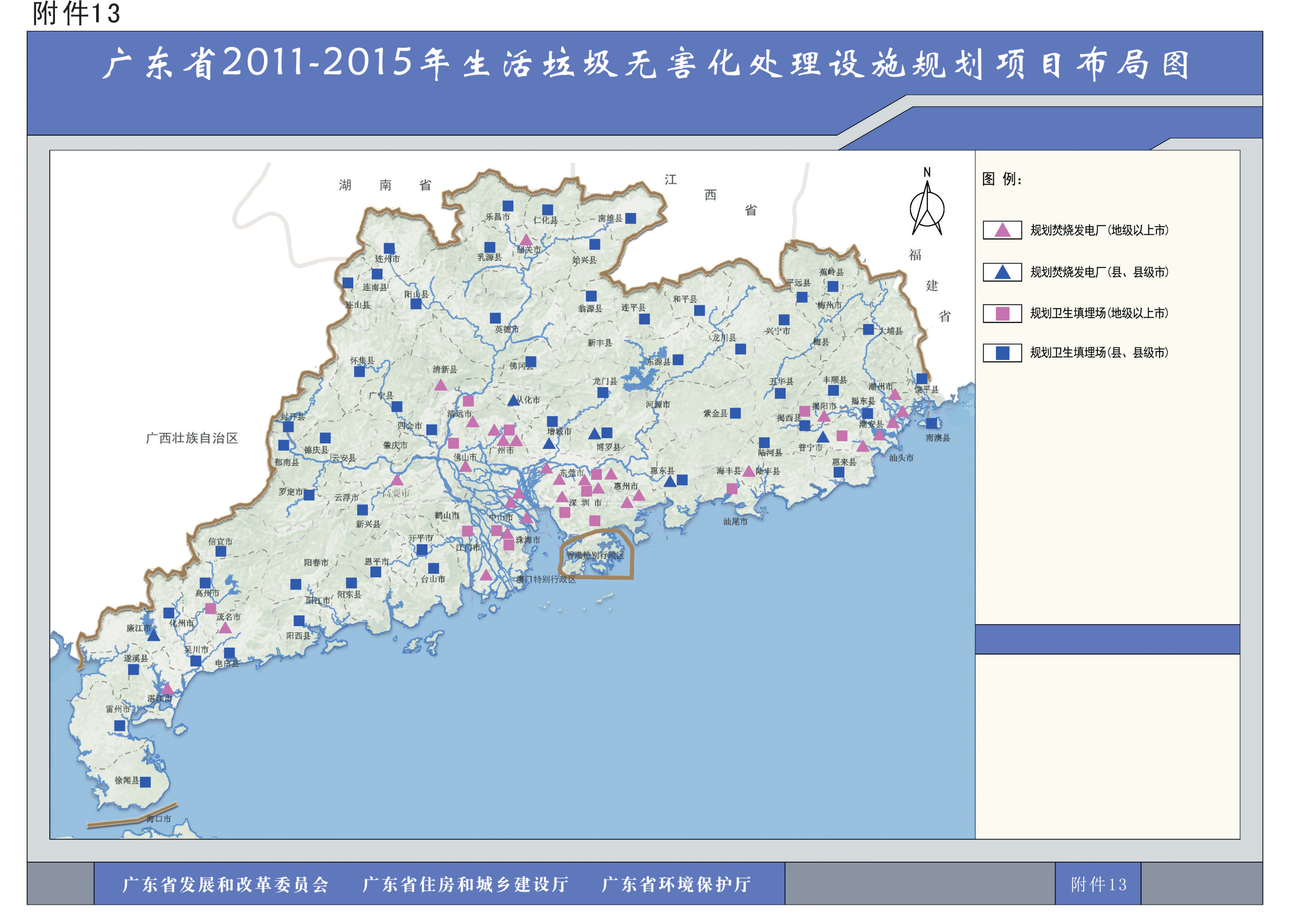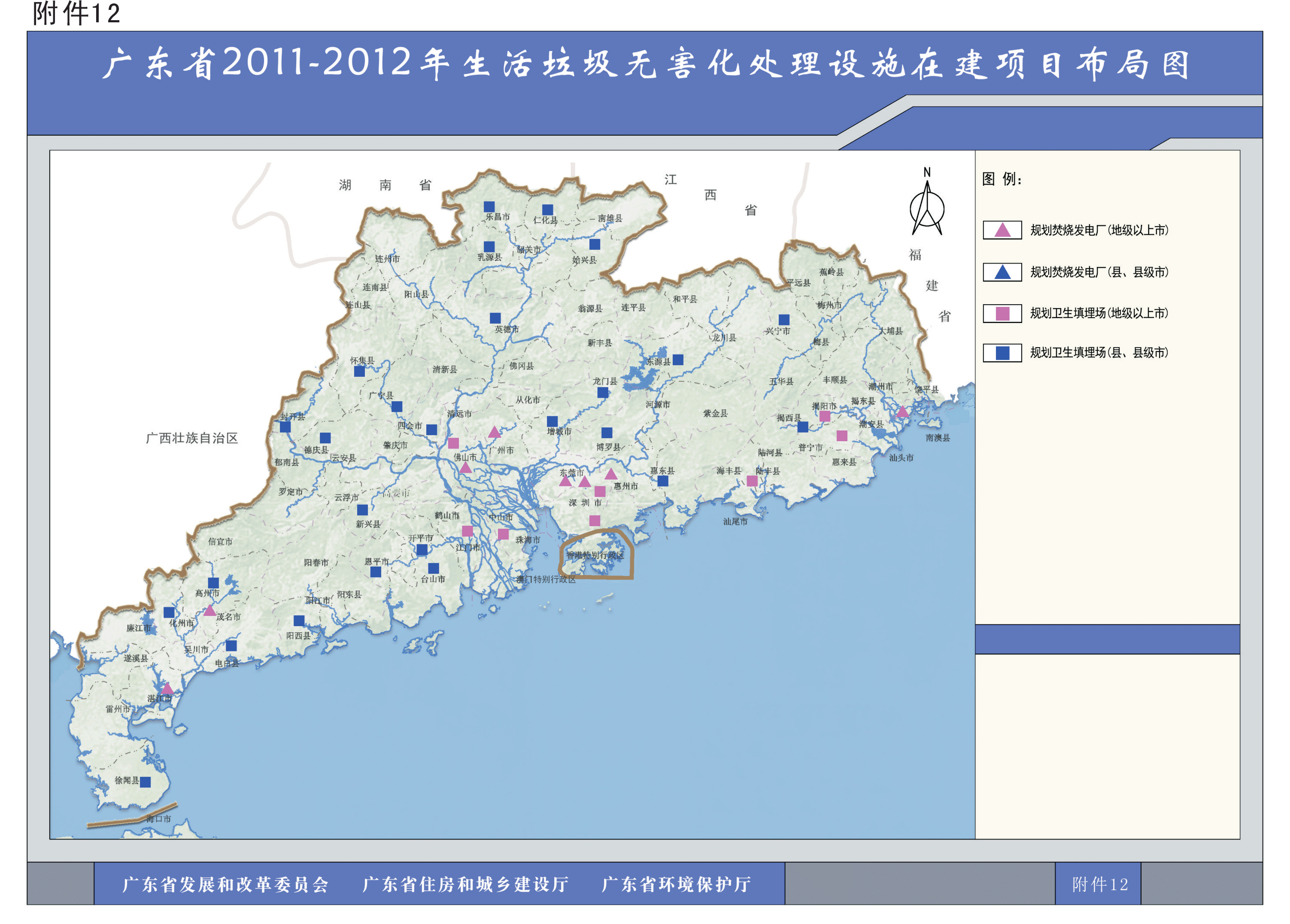 ? 廣東省人民政府辦公廳關(guān)于印發(fā)廣東省生活垃圾 無害化處理設(shè)施建設(shè)“十二五”規(guī)劃的通知 ? 各地級以上市人民政府,各縣(市、區(qū))人民政府,省政府各部門、各直屬機(jī)構(gòu): 《廣東省生活垃圾無害化處理設(shè)施建設(shè)“十二五”規(guī)劃》已經(jīng)省人民政府同意,現(xiàn)印發(fā)給你們,請認(rèn)真組織實(shí)施。實(shí)施中遇到的問題,請徑向省發(fā)展改革委、住房城鄉(xiāng)建設(shè)廳、環(huán)境保護(hù)廳反映。 ? ? ? ? 廣東省人民政府辦公廳 2012年11月13日 ? ? ? ? ? 廣東省生活垃圾無害化處理設(shè)施建設(shè) “十二五”規(guī)劃 ? 目 錄 ? 一、現(xiàn)狀與問題……………………………………………………………………(1) (一)生活垃圾處理現(xiàn)狀…………………………………………………………(1) ?。ǘ┲饕?jīng)驗(yàn)……………………………………………………………………(3) ?。ㄈ┐嬖趩栴}……………………………………………………………………(4) ?。ㄋ模┥罾a(chǎn)生量預(yù)測………………………………………………………(5) 二、指導(dǎo)思想、原則和目標(biāo)………………………………………………………(6) ?。ㄒ唬┲笇?dǎo)思想……………………………………………………………………(6) ?。ǘ┗驹瓌t……………………………………………………………………(6) ?。ㄈ┮?guī)劃目標(biāo)……………………………………………………………………(7) 三、主要任務(wù)………………………………………………………………………(8) ?。ㄒ唬┻x擇生活垃圾無害化處理適用技術(shù)………………………………………(8) ?。ǘ┘涌焐罾鵁o害化處理設(shè)施建設(shè)………………………………………(9) (三)加大存量生活垃圾處理場(廠)治理力度………………………………(10) ?。ㄋ模┩晟剖者\(yùn)轉(zhuǎn)運(yùn)體系…………………………………………………………(10) (五)推行生活垃圾減量化、資源化和循環(huán)利用………………………………(11) 四、投資估算和資金籌措…………………………………………………………(13) ?。ㄒ唬┩顿Y估算……………………………………………………………………(13) ?。ǘ┵Y金籌措……………………………………………………………………(13) 五、保障措施………………………………………………………………………(14) ?。ㄒ唬?qiáng)化組織保障………………………………………………………………(14) (二)加強(qiáng)項(xiàng)目建設(shè)管理…………………………………………………………(17) ?。ㄈ?qiáng)化政策保障………………………………………………………………(19) 六、相關(guān)術(shù)語………………………………………………………………………(19) 附件1 廣東省2011-2012年生活垃圾無害化處理設(shè)施近期項(xiàng)目表……………(22) 附件2 廣東省2011-2015年生活垃圾無害化處理設(shè)施規(guī)劃項(xiàng)目表……………(25) 附件3 廣東省2011-2015年生活垃圾焚燒發(fā)電廠規(guī)劃項(xiàng)目表…………………(30) 附件4 廣東省2016-2020年生活垃圾焚燒發(fā)電廠儲備項(xiàng)目表…………………(33) 附件5 廣東省2011-2015年生活垃圾簡易處理場(廠)治理項(xiàng)目表…………(35) 附件6 廣東省2011-2015年生活垃圾無害化處理場(廠)封場項(xiàng)目表………(38) 附件7 廣東省2011-2015年生活垃圾轉(zhuǎn)運(yùn)站及運(yùn)輸車輛規(guī)劃表………………(41) 附件8 廣東省2011-2015年餐廚垃圾處理設(shè)施規(guī)劃項(xiàng)目表……………………(46) 附件9 廣東省2015年末生活垃圾無害化處理水平核算表……………………(48) 附件10 廣東省2011-2015年生活垃圾無害化處理設(shè)施規(guī)劃投資表 …………(52) 附件11 廣東省2010年末生活垃圾處理設(shè)施現(xiàn)狀項(xiàng)目布局圖…………………(53) 附件12 廣東省2011-2012年生活垃圾無害化處理設(shè)施在建項(xiàng)目布局圖 ……(54) 附件13 廣東省2011-2015年生活垃圾無害化處理設(shè)施規(guī)劃項(xiàng)目布局圖 ……(55) ? ? 為提高廣東省城鎮(zhèn)生活垃圾無害化處理水平,切實(shí)改善城鄉(xiāng)人居環(huán)境,根據(jù)《國務(wù)院辦公廳關(guān)于印發(fā)“十二五”全國城鎮(zhèn)生活垃圾無害化處理設(shè)施建設(shè)規(guī)劃的通知》(國辦發(fā)〔2012〕23號)的總體部署,編制本規(guī)劃。 本規(guī)劃范圍包括全省21個地級以上市的城區(qū)、23個縣級市的城區(qū)、44個縣城及生活垃圾處理設(shè)施服務(wù)輻射到的周邊鄉(xiāng)鎮(zhèn)(以上范圍在本規(guī)劃中統(tǒng)稱為城鎮(zhèn))。規(guī)劃基準(zhǔn)年為2010年,規(guī)劃期為2011年至2015年,其中部分生活垃圾處理項(xiàng)目建設(shè)展望至2020年。 一、現(xiàn)狀與問題 生活垃圾處理是城鄉(xiāng)管理和環(huán)境保護(hù)的重要內(nèi)容,是政府履行公共服務(wù)職能的一項(xiàng)重要任務(wù),直接關(guān)系到人民群眾的切身利益。近年來,我省生活垃圾收運(yùn)系統(tǒng)日趨完善,處理能力不斷提高,生活垃圾無害化處理水平總體上有了較大提升。 (一)生活垃圾處理現(xiàn)狀。 “十一五”期間全省除汕尾、茂名市外,其他19