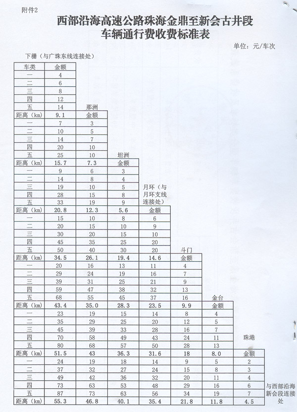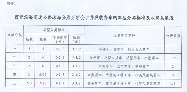 ? 廣東省人民政府辦公廳關(guān)于西部沿海高速公路 珠海金鼎至新會古井段金臺收費站車輛 通行費有關(guān)問題的復(fù)函 ? 省交通運輸廳、物價局: 粵交費〔2012〕1426號請示收悉。省人民政府同意西部沿海高速公路珠海金鼎至新會古井段金臺互通立交交工驗收通車和金臺收費站收費設(shè)施經(jīng)驗收符合省聯(lián)網(wǎng)收費技術(shù)要求后開始收費,收費車型按全省高速公路統(tǒng)一標(biāo)準,即按車輛軸(輪)數(shù)及車頭高度等物理參數(shù)進行分類,一至五類車的收費系數(shù)分別為1、1.5、2、3、3.5;收費標(biāo)準按雙向4車道0.45元/標(biāo)準車公里執(zhí)行。 ? 附件:1.西部沿海高速公路珠海金鼎至新會古井段收費車輛車型分類標(biāo)準及收費系數(shù)表 2.西部沿海高速公路珠海金鼎至新會古井段車輛通行費收費標(biāo)準表 ? ? ? ? 省府辦公廳 2012年12月20日 ? ? ? ?