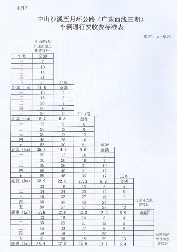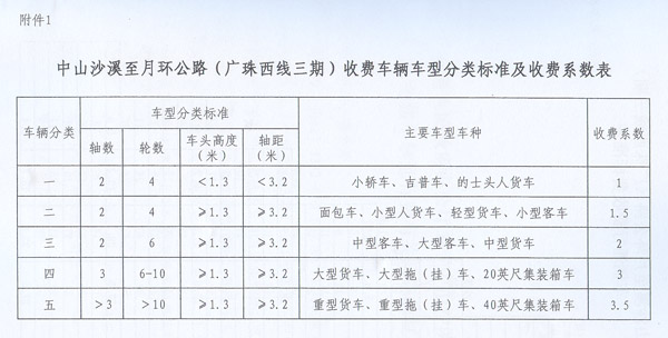 ? 廣東省人民政府辦公廳關于中山沙溪至月環(huán) 公路車輛通行費有關問題的復函 ? 省交通運輸廳、物價局: 粵交費〔2012〕1332號請示收悉。省人民政府同意中山沙溪至月環(huán)公路(廣珠西線三期)交工驗收通車和收費站收費設施經(jīng)驗收符合省聯(lián)網(wǎng)收費技術要求后開始收費,收費車型按全省高速公路統(tǒng)一標準,即按車輛軸(輪)數(shù)及車頭高度等物理參數(shù)進行分類,一至五類車的收費系數(shù)分別為1、1.5、2、3、3.5;收費標準按雙向6 車道以上0.6元/標準車公里執(zhí)行。 ? ? 附件:1.中山沙溪至月環(huán)公路(廣珠西線三期)收費車輛車型分類標準及收費系數(shù)表 2.中山沙溪至月環(huán)公路(廣珠西線三期)車輛通行費收費標準表 ? ? ? 省府辦公廳 2012年12月20日 ? ? ?