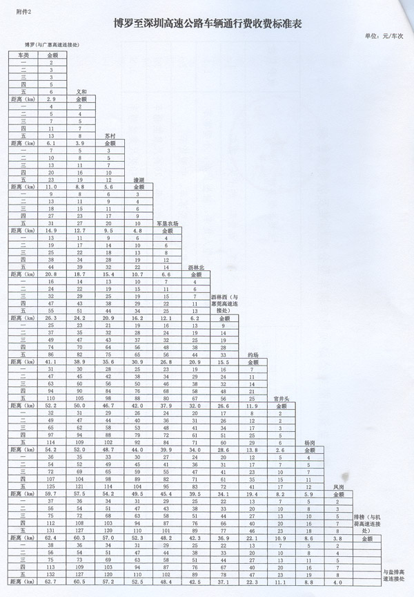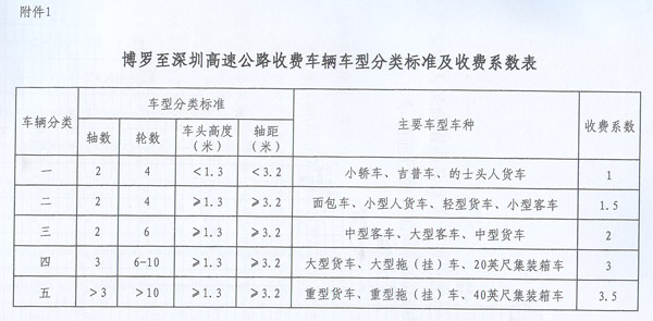 ? 廣東省人民政府辦公廳關(guān)于博羅至深圳高速公路 車(chē)輛通行費(fèi)有關(guān)問(wèn)題的復(fù)函 ? 省交通運(yùn)輸廳、物價(jià)局: 粵交費(fèi)〔2012〕1423號(hào)請(qǐng)示收悉。省人民政府同意博羅至深圳高速公路交工驗(yàn)收通車(chē)和收費(fèi)站收費(fèi)設(shè)施經(jīng)驗(yàn)收符合省聯(lián)網(wǎng)收費(fèi)技術(shù)要求后開(kāi)始收費(fèi),收費(fèi)車(chē)型按全省高速公路統(tǒng)一標(biāo)準(zhǔn),即按車(chē)輛軸(輪)數(shù)及車(chē)頭高度等物理參數(shù)進(jìn)行分類(lèi),一至五類(lèi)車(chē)的收費(fèi)系數(shù)分別為1、1.5、2、3、3.5;收費(fèi)標(biāo)準(zhǔn)按雙向6 車(chē)道以上0.6元/ 標(biāo)準(zhǔn)車(chē)公里執(zhí)行。 ? ? 附件:1.博羅至深圳高速公路收費(fèi)車(chē)輛車(chē)型分類(lèi)標(biāo)準(zhǔn)及收費(fèi)系數(shù)表 ? 2.博羅至深圳高速公路車(chē)輛通行費(fèi)收費(fèi)標(biāo)準(zhǔn)表 ? ? ? 省府辦公廳 2012年12月20日 ? ? ? ?