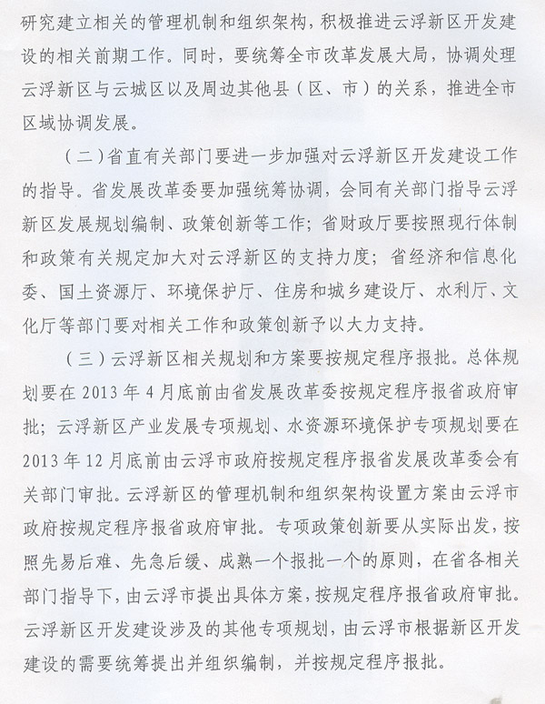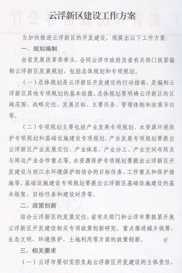 廣東省人民政府辦公廳關(guān)于印發(fā)云浮新區(qū) 建設(shè)工作方案的通知? 經(jīng)省人民政府同意,現(xiàn)將《云浮新區(qū)建設(shè)工作方案》印發(fā)給你們,請認真貫徹執(zhí)行。? ? ? ? 省府辦公廳 2013年3月1日