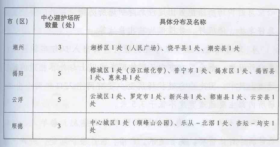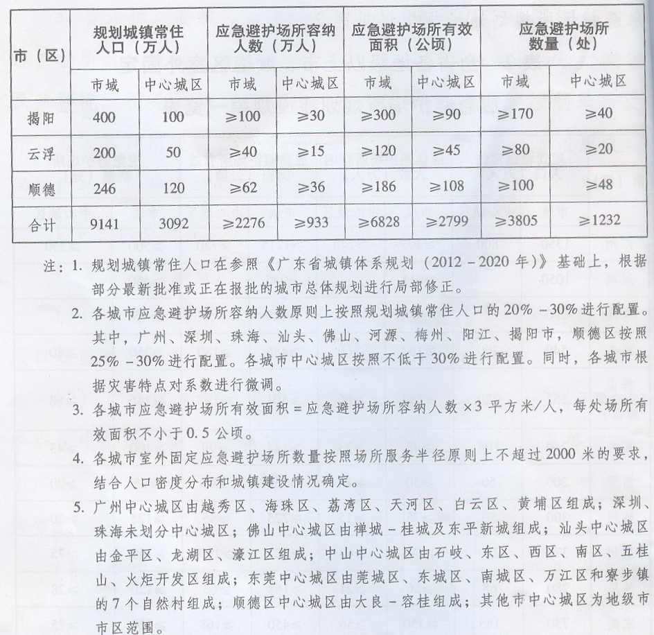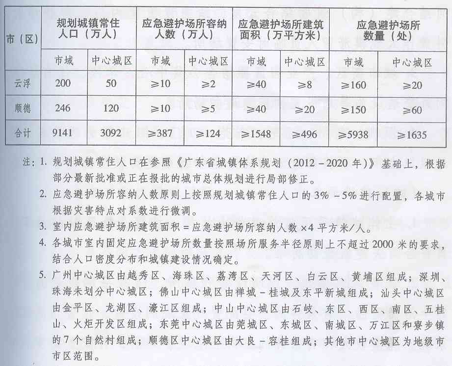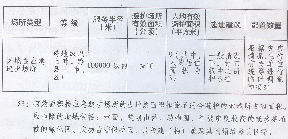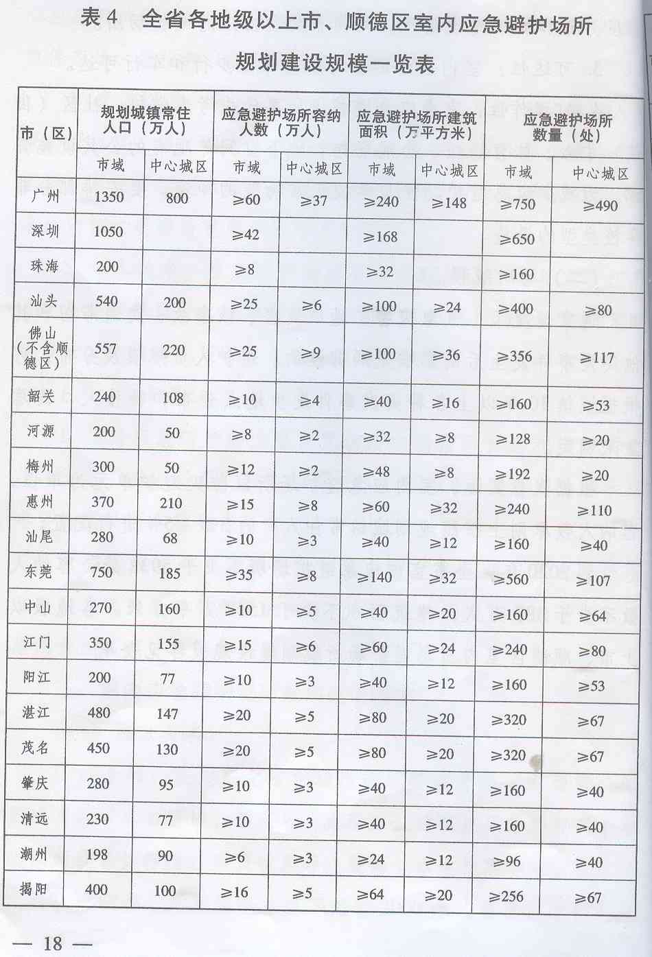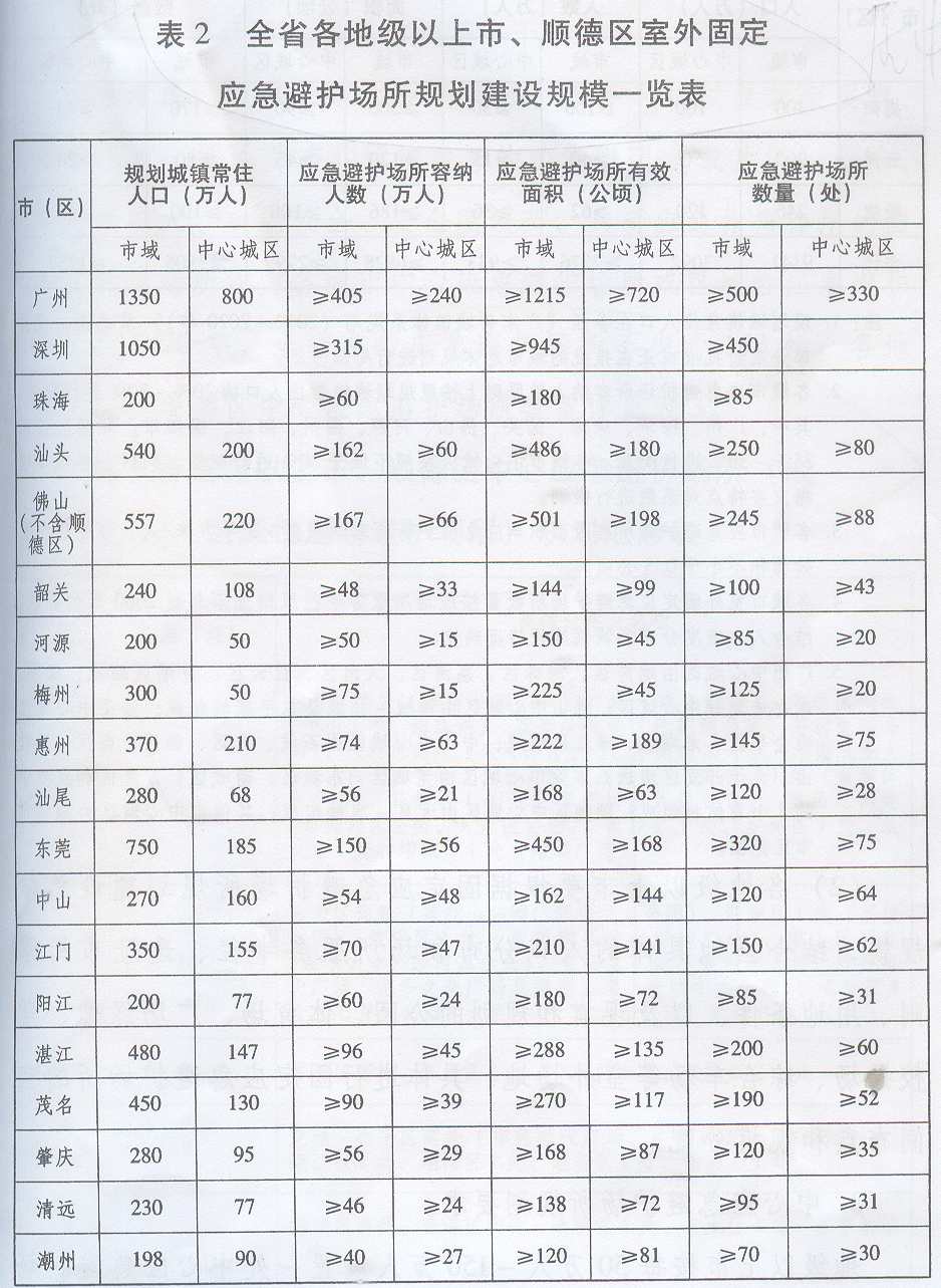 (四)建設(shè)要求。 1.科學(xué)選址。應(yīng)急避護(hù)場(chǎng)所要避開(kāi)可能發(fā)生各類地質(zhì)災(zāi)害以及次生災(zāi)害的地區(qū);遠(yuǎn)離水庫(kù)泄洪區(qū)、洪水泛濫區(qū)、低洼地易積水地區(qū);周邊建筑要滿足抗震、防風(fēng)等防災(zāi)要求,并預(yù)留防護(hù)距離。所有應(yīng)急避護(hù)場(chǎng)所建設(shè)要進(jìn)行嚴(yán)格的場(chǎng)所安全性評(píng)價(jià),尤其要根據(jù)其應(yīng)對(duì)災(zāi)種進(jìn)行針對(duì)性的安全評(píng)價(jià),并根據(jù)評(píng)價(jià)結(jié)果采取必要的防護(hù)措施或選擇其他替代場(chǎng)所。 2.分區(qū)合理。工程處理后地形坡度不宜大于7度,植被要以疏林、草地為主,易于搭建帳篷及臨時(shí)建筑,適宜根據(jù)承擔(dān)功能劃定棚宿區(qū)、應(yīng)急指揮區(qū)、救援隊(duì)伍駐扎區(qū)、應(yīng)急醫(yī)療區(qū)、物資儲(chǔ)備區(qū)等功能分區(qū)。 3.配套齊全。應(yīng)急避護(hù)場(chǎng)所要配置指揮管理、應(yīng)急供水、供電、廁所、消防、排污、垃圾儲(chǔ)運(yùn)、醫(yī)療救護(hù)及防疫、物資儲(chǔ)備、洗浴、信息發(fā)布等設(shè)施,必要時(shí),要增設(shè)氣象觀測(cè)設(shè)施。中心應(yīng)急避護(hù)場(chǎng)所除配置固定應(yīng)急避護(hù)場(chǎng)所必需設(shè)施外,要設(shè)置應(yīng)急停車場(chǎng)、停機(jī)坪、救援部隊(duì)駐扎營(yíng)地等。 4.交通暢通。室外應(yīng)急避護(hù)場(chǎng)所人員出入口與車輛出入口要分開(kāi)設(shè)置,最少要有方向不同的兩條或以上與外界相通的疏散通道。其中,固定應(yīng)急避護(hù)場(chǎng)所至少要有兩個(gè)入口和兩個(gè)出口,場(chǎng)所內(nèi)部主要通道寬度不低于35米。 5.以人為本。應(yīng)急避護(hù)場(chǎng)所要考慮殘疾人、老年人、傷病員等弱勢(shì)群體需要,完善通訊、廣播、醫(yī)療救護(hù)功能,進(jìn)行無(wú)障礙設(shè)計(jì),如坡道化設(shè)計(jì)、安排無(wú)障礙廁位等。 (五)標(biāo)識(shí)系統(tǒng)。 1.室外應(yīng)急避護(hù)場(chǎng)所要設(shè)置場(chǎng)所內(nèi)部指示標(biāo)志和場(chǎng)所周邊指示標(biāo)志。標(biāo)志樣式、顏色等內(nèi)容詳見(jiàn)附件2。場(chǎng)所周邊指示標(biāo)志要標(biāo)明場(chǎng)所名稱和類型。 2.室外應(yīng)急避護(hù)場(chǎng)所出入口等位置,要標(biāo)明應(yīng)急避護(hù)場(chǎng)所適用的災(zāi)害類型及所承擔(dān)的主要功能。室外固定應(yīng)急避護(hù)場(chǎng)所要繪制責(zé)任區(qū)域分布圖和內(nèi)部功能分區(qū)圖。 五、室內(nèi)應(yīng)急避護(hù)場(chǎng)所規(guī)劃建設(shè)要求 (一)選址要求。 1.安全性:室內(nèi)應(yīng)急避護(hù)場(chǎng)所選址要避開(kāi)地震斷裂帶、地質(zhì)災(zāi)害區(qū)、內(nèi)澇區(qū)域,遠(yuǎn)離各類危險(xiǎn)源;建筑抗風(fēng)等級(jí)要高于本地風(fēng)荷載設(shè)計(jì)標(biāo)準(zhǔn);建筑抗震等級(jí)要高于本地抗震標(biāo)準(zhǔn)。 2.均衡性:按照服務(wù)半徑不超過(guò)2000米的要求,結(jié)合人口密度分布和城鎮(zhèn)建設(shè)情況,均衡布局室內(nèi)應(yīng)急避護(hù)場(chǎng)所。 3.可達(dá)性:室內(nèi)應(yīng)急避護(hù)場(chǎng)所要保證步行和車行可達(dá)。 4.可操作性:室內(nèi)應(yīng)急避護(hù)場(chǎng)所要優(yōu)先考慮學(xué)校、社區(qū)(街鎮(zhèn))中心、體育場(chǎng)館、會(huì)展場(chǎng)館、地下空間等現(xiàn)有的公共設(shè)施資源。為減少應(yīng)急避護(hù)功能與學(xué)校正常功能的沖突,要安排部分非學(xué)校類型的設(shè)施。 (二)場(chǎng)所規(guī)模。 通常情況下,氣象災(zāi)害、地質(zhì)災(zāi)害、核事故、交通滯留和其他突發(fā)事件發(fā)生后的影響是局部性的。避護(hù)人員規(guī)模及分布,可根據(jù)城鎮(zhèn)10年以上各種突發(fā)事件發(fā)生地點(diǎn)分布和轉(zhuǎn)移人口的總量來(lái)確定。 根據(jù)我省實(shí)際,室內(nèi)應(yīng)急避護(hù)場(chǎng)所以防災(zāi)避護(hù)單元為單位,容納人數(shù)原則上按照規(guī)劃城鎮(zhèn)常住人口的3%-5%進(jìn)行配置。 到2020年,全省室內(nèi)應(yīng)急避護(hù)場(chǎng)所不少于5938處,容納人數(shù)不少于387萬(wàn)人,建筑面積不少于1548萬(wàn)平方米。各地級(jí)以上市、順德區(qū)室內(nèi)應(yīng)急避護(hù)場(chǎng)所規(guī)劃建設(shè)規(guī)模詳見(jiàn)表4。 表4全省各地級(jí)以上市、順德區(qū)室內(nèi)應(yīng)急避護(hù)場(chǎng)所規(guī)劃建設(shè)規(guī)模一覽表 ?