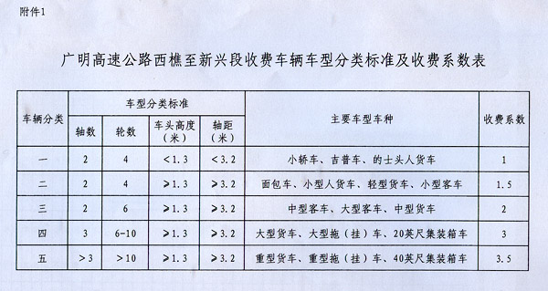 粵交費〔2013〕1301號請示收悉。省人民政府同意廣明高速公路更樓至新興段(廣明高速公路延長線)交工驗收通車和收費站收費設(shè)施經(jīng)驗收符合省聯(lián)網(wǎng)收費技術(shù)要求后開始收費,收費車型按全省高速公路統(tǒng)一標準,即按車輛軸(輪)數(shù)及車頭高度等物理參數(shù)進行分類,一至五類車的收費系數(shù)分別為1、1.5、2、3、3.5;收費標準為0.6元/標準車公里。
