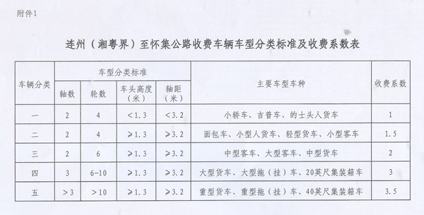 粵交費(fèi)〔2013〕1300號(hào)請(qǐng)示收悉。省人民政府同意連州(湘粵界)至懷集公路(即二廣高速公路懷集至連州段)交工驗(yàn)收通車和收費(fèi)站收費(fèi)設(shè)施經(jīng)驗(yàn)收符合省聯(lián)網(wǎng)收費(fèi)技術(shù)要求后開(kāi)始收費(fèi),收費(fèi)車型按全省高速公路統(tǒng)一標(biāo)準(zhǔn),即按車輛軸(輪)數(shù)及車頭高度等物理參數(shù)進(jìn)行分類,一至五類車的收費(fèi)系數(shù)分別為1、1.5、2、3、3.5;粵湘省界至鶴塘段及連州連接線收費(fèi)標(biāo)準(zhǔn)為0.45元/標(biāo)準(zhǔn)車公里,鶴塘至懷集南段及懷集支線收費(fèi)標(biāo)準(zhǔn)為0.6元/標(biāo)準(zhǔn)車公里。