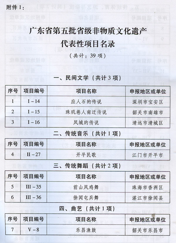 ? ? 廣東省人民政府關(guān)于批準(zhǔn)并公布廣東省 第五批省級(jí)非物質(zhì)文化遺產(chǎn)名錄的通知