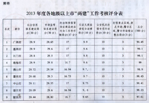 2013年以來(lái),全省各地認(rèn)真貫徹落實(shí)省委、省政府關(guān)于社會(huì)信用體系建設(shè)和市場(chǎng)監(jiān)管體系建設(shè)(以下簡(jiǎn)稱“兩建”)工作的各項(xiàng)部署,加強(qiáng)組織領(lǐng)導(dǎo),明確分工責(zé)任,分解工作任務(wù),有計(jì)劃、有目標(biāo)、有步驟地組織開展“兩建”工作,為我省經(jīng)濟(jì)平穩(wěn)健康發(fā)展、社會(huì)和諧穩(wěn)定作出了積極貢獻(xiàn)。根據(jù)《中共廣東省委辦公廳廣東省人民政府辦公廳關(guān)于撤并和規(guī)范省級(jí)考核檢查評(píng)比表彰活動(dòng)的意見》(粵辦發(fā)〔2013〕11號(hào)),2014年1月,省“兩建”工作領(lǐng)導(dǎo)小組辦公室對(duì)各地級(jí)以上市“兩建”工作進(jìn)行了考核。經(jīng)綜合評(píng)定,21個(gè)地級(jí)以上市“兩建”工作考核全部合格,其中,廣州、惠州、江門、珠海市成績(jī)比較顯著。經(jīng)省人民政府同意,現(xiàn)將各地“兩建”工作情況通報(bào)如下: 一、精心部署落實(shí) 省“兩建”工作會(huì)議召開后,各地級(jí)以上市政府高度重視,及時(shí)召開相關(guān)工作會(huì)議,認(rèn)真貫徹落實(shí)省委、省政府關(guān)于“兩建”工作的政策部署,并以多種形式出臺(tái)有關(guān)文件,狠抓各項(xiàng)工作任務(wù)落實(shí)。在市場(chǎng)監(jiān)管體系建設(shè)方面,廣州、深圳等市結(jié)合實(shí)際制定了本市的市場(chǎng)監(jiān)管體系建設(shè)規(guī)劃,惠州、陽(yáng)江等市制定了貫徹落實(shí)省市場(chǎng)監(jiān)管體系建設(shè)規(guī)劃的實(shí)施意見;在社會(huì)信用體系建設(shè)方面,廣州、珠海、中山等市制訂了《社會(huì)信用體系建設(shè)規(guī)劃(2013—2020年)》,廣州市還出臺(tái)了《廣州市信息共享管理規(guī)定》、《廣州市社會(huì)信用促進(jìn)條例》等多項(xiàng)規(guī)章制度。 一是市場(chǎng)準(zhǔn)入體系建設(shè)取得較大突破。率先在全國(guó)開展商事登記制度改革試點(diǎn),按照“寬進(jìn)嚴(yán)管”的原則,推進(jìn)工商登記制度改革,清理、壓減前置審批事項(xiàng),放寬登記準(zhǔn)入條件,實(shí)行先證后照,強(qiáng)化事中、事后監(jiān)管。2013年3月1日,深圳、珠海正式實(shí)施具有地方性法規(guī)效力的商事登記制度。據(jù)統(tǒng)計(jì),深圳、珠海、東莞、順德等商事登記制度改革試點(diǎn)地區(qū),新登記市場(chǎng)主體增幅分別達(dá)到96.3%、41.5%、17.0%和16.4%,同期非試點(diǎn)地區(qū)市場(chǎng)主體增幅僅為0.5%。二是行政執(zhí)法體系建設(shè)取得良好效果。進(jìn)一步深化行政審批制度改革,大力簡(jiǎn)政放權(quán),共調(diào)整市級(jí)行政審批事項(xiàng)6165項(xiàng)、縣級(jí)14934項(xiàng)。積極探索建立綜合行政執(zhí)法體制,推動(dòng)執(zhí)法重心下移。佛山市順德區(qū)按土地、醫(yī)藥、市場(chǎng)、城市管理四大領(lǐng)域,整合行政執(zhí)法職責(zé)和隊(duì)伍,規(guī)范行政執(zhí)法行為,規(guī)范行政處罰自由裁量權(quán);珠海市制定《珠海市行政機(jī)關(guān)執(zhí)法依據(jù)匯編》、《珠海市規(guī)范行政處罰自由裁量權(quán)工作方案》。三是消費(fèi)維權(quán)和社會(huì)監(jiān)督體系建設(shè)取得重大進(jìn)展。以“12345”熱線為載體整合各部門投訴舉報(bào)資源,建設(shè)便民、高效的消費(fèi)維權(quán)申訴、經(jīng)濟(jì)違法行為舉報(bào)和行政效能投訴平臺(tái),實(shí)現(xiàn)統(tǒng)一接聽、按責(zé)轉(zhuǎn)辦、限時(shí)辦結(jié)、統(tǒng)一督辦、統(tǒng)一考核。除東莞、揭陽(yáng)市外,目前全省已有19個(gè)地級(jí)以上市實(shí)現(xiàn)“12345”統(tǒng)一投訴舉報(bào)平臺(tái)上線運(yùn)行。四是政務(wù)誠(chéng)信建設(shè)深入推進(jìn)。積極推進(jìn)招標(biāo)投標(biāo)和政府采購(gòu)領(lǐng)域政務(wù)誠(chéng)信建設(shè),全部實(shí)現(xiàn)各市縣網(wǎng)上辦事分廳與省網(wǎng)上辦事大廳對(duì)接,實(shí)現(xiàn)省、市、縣(區(qū))三級(jí)數(shù)據(jù)同步,進(jìn)一步提高行政審批效率。珠海市圍繞電子政務(wù)、科學(xué)民主決策等方面開展政務(wù)誠(chéng)信建設(shè),在網(wǎng)上辦事大廳珠海分廳增加公共資源網(wǎng)上交易、市民個(gè)人網(wǎng)頁(yè)等內(nèi)容。五是加快推進(jìn)質(zhì)量監(jiān)管體系建設(shè)。強(qiáng)化“不合格產(chǎn)品發(fā)現(xiàn)率”理念,著力完善產(chǎn)(商)品監(jiān)督抽查制度,大力實(shí)施標(biāo)準(zhǔn)化戰(zhàn)略,提升電子商務(wù)質(zhì)量,逐步建立現(xiàn)代質(zhì)量監(jiān)管體系。廣州、惠州等市大力完善公共與民生服務(wù)領(lǐng)域標(biāo)準(zhǔn)體系,深圳、佛山等市改革流通領(lǐng)域商品監(jiān)管方式,中山、茂名等市加強(qiáng)產(chǎn)品質(zhì)量監(jiān)督抽查,梅州、肇慶等市大力推動(dòng)旅游電子合同。六是進(jìn)一步理順食品安全監(jiān)管體制機(jī)制。以食品安全監(jiān)管體制改革為契機(jī),進(jìn)一步理順食品安全監(jiān)管職責(zé),出臺(tái)市縣兩級(jí)食品安全監(jiān)管體制改革文件,做好機(jī)構(gòu)編制、職能調(diào)整和人員劃分等工作。 一是信用激勵(lì)和懲戒機(jī)制建設(shè)取得明顯成效。惠州、珠海市分別出臺(tái)了《關(guān)