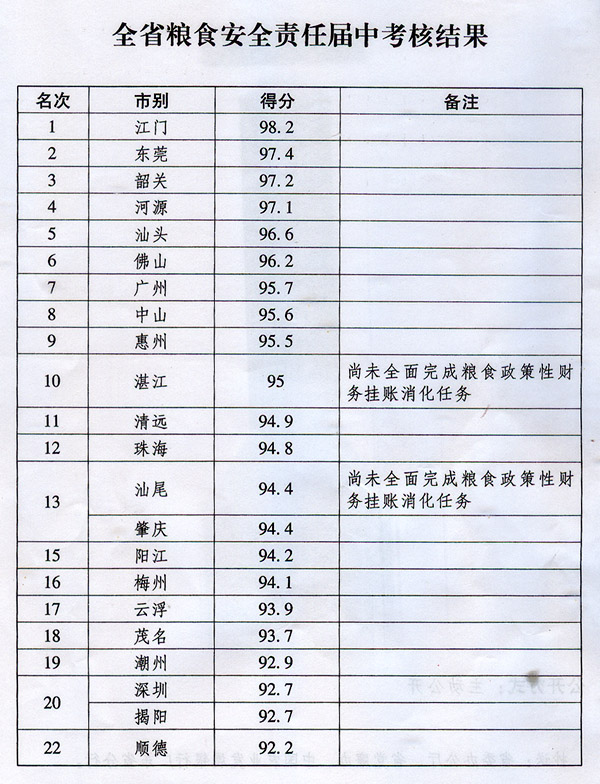 根據(jù)《廣東省糧食安全責(zé)任考核辦法》(粵府辦〔2012〕28號)規(guī)定,省糧食局會(huì)同有關(guān)部門對各地級以上市和順德區(qū)政府落實(shí)糧食安全責(zé)任情況進(jìn)行了屆中考核。經(jīng)省人民政府同意,現(xiàn)將考核情況通報(bào)如下: 一、基本情況 近年來,全省各地認(rèn)真貫徹落實(shí)黨中央、國務(wù)院和省委、省政府關(guān)于糧食工作的各項(xiàng)部署,按照糧食工作各級政府負(fù)責(zé)制的要求,深化糧食流通體制改革,完善糧庫和糧食市場體系建設(shè),強(qiáng)化糧食流通監(jiān)管,穩(wěn)定和發(fā)展糧食生產(chǎn)。在糧食自給率較低、外購糧食數(shù)量不斷增多、國內(nèi)外糧食市場形勢復(fù)雜多變的情況下,保障了全省糧食供應(yīng)和價(jià)格基本穩(wěn)定,確保了全國第一人口大省、全國最大糧食主銷區(qū)的糧食安全。但部分地區(qū)的糧食安全保障工作仍存在一些薄弱環(huán)節(jié),主要表現(xiàn)在對糧食工作的重視程度不夠,工作保障力量有待增強(qiáng);糧油儲(chǔ)備和應(yīng)急體系不完善,糧食流通基礎(chǔ)設(shè)施建設(shè)有待加快推進(jìn)、產(chǎn)業(yè)化水平有待提高、監(jiān)管合力有待增強(qiáng);個(gè)別市糧食政策性財(cái)務(wù)掛賬消化任務(wù)尚未全面完成。 全省21個(gè)地級以上市和順德區(qū)政府糧食安全責(zé)任屆中考核均合格(具體結(jié)果見附表)。 ? ? ? 省府辦公廳 2014年6月2日 ? ? ?