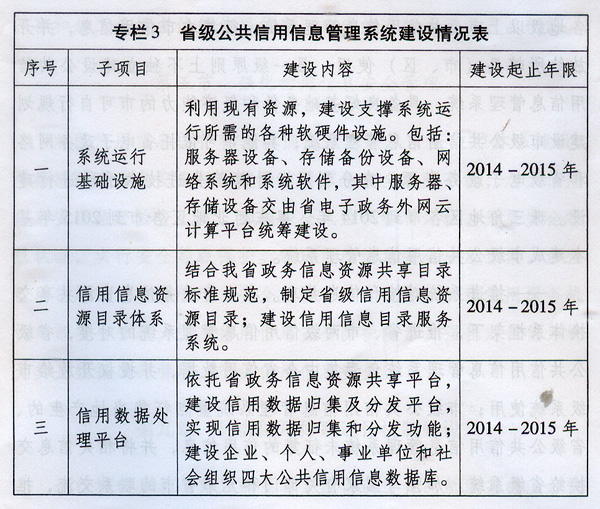 ? 按照統(tǒng)一規(guī)劃、統(tǒng)一信息標(biāo)準(zhǔn)和技術(shù)規(guī)范、不重復(fù)建設(shè)的原則,依托有關(guān)行業(yè)和政府部門現(xiàn)有業(yè)務(wù)管理信息系統(tǒng),以及我省電子政務(wù)等資源,改造完善相關(guān)基礎(chǔ)設(shè)施,建立和完善各行業(yè)和部門的縱向信用信息系統(tǒng),并加強(qiáng)對本行業(yè)社會成員信用信息的記錄和整合。以全省人口基礎(chǔ)信息庫為依托,完善自然人信用記錄;建立完善覆蓋全省的人民法院被執(zhí)行人信息查詢系統(tǒng);加強(qiáng)檢察機(jī)關(guān)行政執(zhí)法和刑事司法相銜接的信息平臺建設(shè),完善行賄犯罪檔案系統(tǒng);推進(jìn)預(yù)防腐敗信息系統(tǒng)、犯罪人員犯罪記錄系統(tǒng)等信息平臺建設(shè),促進(jìn)懲防腐敗體系建設(shè)。全面推進(jìn)全省行政執(zhí)法機(jī)關(guān)、公安機(jī)關(guān)、監(jiān)察機(jī)關(guān)、檢察機(jī)關(guān)之間執(zhí)法、司法信息共享,完善網(wǎng)上移送、網(wǎng)上受理、網(wǎng)上監(jiān)督機(jī)制。以行業(yè)、部門的管理服務(wù)需求為導(dǎo)向,依托省電子政務(wù)信息資源共享平臺,建立部門間信用信息的交換共享機(jī)制,著力消除“信息孤島”。到2015年,全部涉信行業(yè)和部門實現(xiàn)信用信息省級集中。