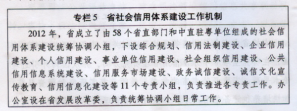 ? 第一節(jié) 加強(qiáng)組織領(lǐng)導(dǎo) ? ——強(qiáng)化統(tǒng)籌協(xié)調(diào)。省社會信用體系建設(shè)統(tǒng)籌協(xié)調(diào)小組承擔(dān)規(guī)劃實施的協(xié)調(diào)指導(dǎo)工作,建立定期會商制度,研究解決社會信用體系建設(shè)中的重大問題;各專責(zé)小組及其成員單位根據(jù)規(guī)劃確定的建設(shè)任務(wù),按照職責(zé)分工,制訂行動計劃,全力推進(jìn)相關(guān)建設(shè)工作。各地社會信用體系建設(shè)統(tǒng)籌協(xié)調(diào)小組要切實加強(qiáng)對本地區(qū)社會信用體系建設(shè)的協(xié)調(diào)指導(dǎo)。? ? ——總結(jié)推廣試點經(jīng)驗??偨Y(jié)廣州、珠海、汕頭、惠州、云浮、順德等地及信貸、稅務(wù)等行業(yè)的社會信用體系建設(shè)試點工作經(jīng)驗,有計劃、分步驟在全省范圍內(nèi)予以推廣。鼓勵各地各部門結(jié)合實際,在相關(guān)領(lǐng)域加大探索力度。