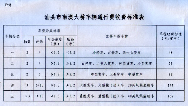 粵交費(fèi)〔2015〕197號(hào)請(qǐng)示收悉。同意汕頭市南澳大橋項(xiàng)目建成通車(chē)后在大橋接入南澳島處設(shè)置南澳大橋收費(fèi)站,單向收取入島車(chē)輛雙程通行費(fèi)。收費(fèi)車(chē)型按車(chē)輛軸(輪)數(shù)及車(chē)頭高度等物理參數(shù)進(jìn)行分類(lèi),一至五類(lèi)車(chē)的收費(fèi)系數(shù)分別為1、1.5、2、3、3.5;單程收費(fèi)標(biāo)準(zhǔn)分別為48、72、96、144、168元/車(chē)次。