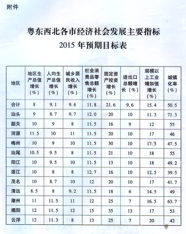 附件:粵東西北各市經濟社會發(fā)展主要指標2015年預期目標表