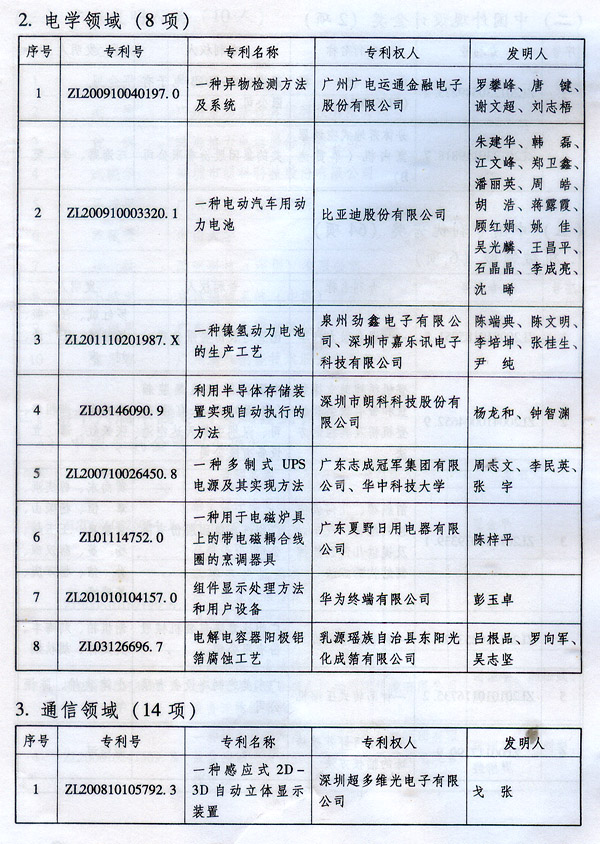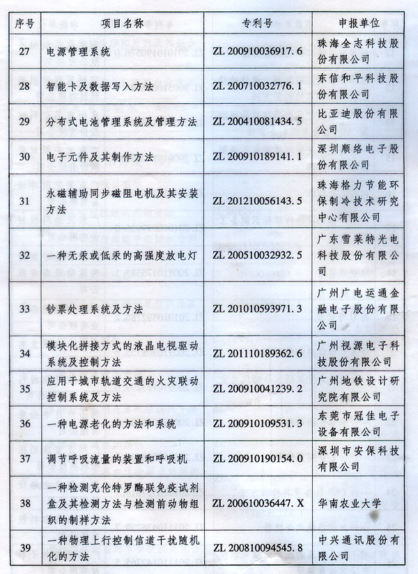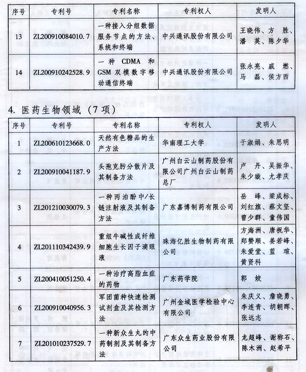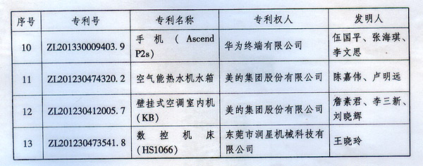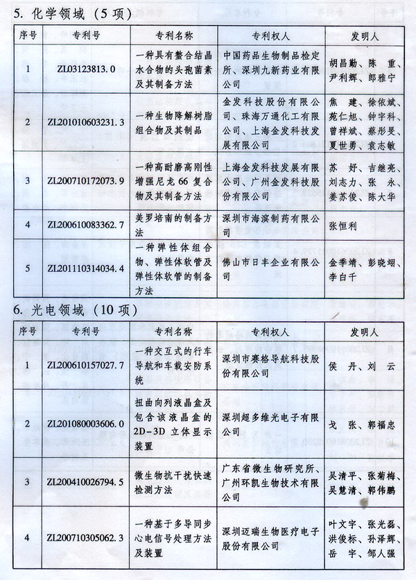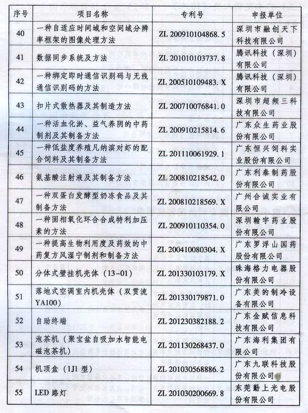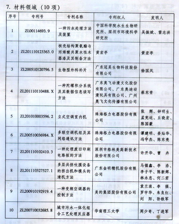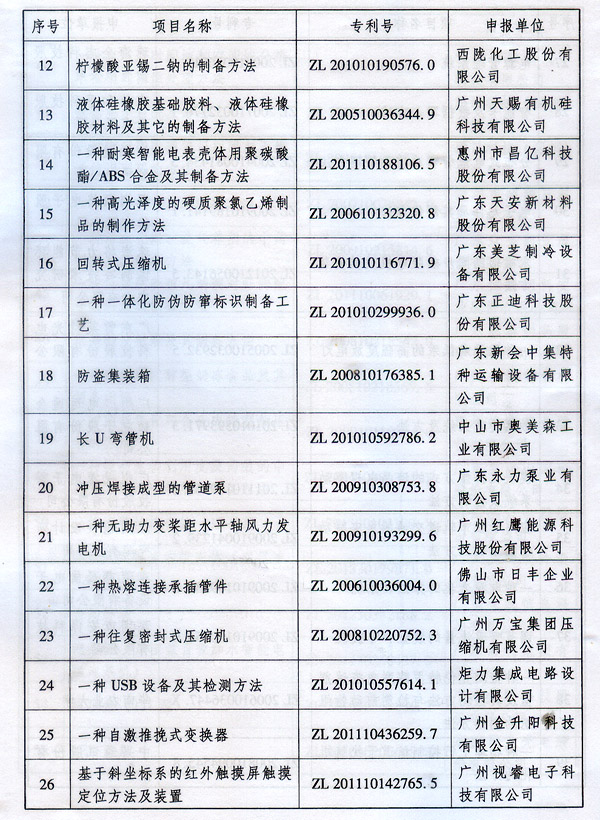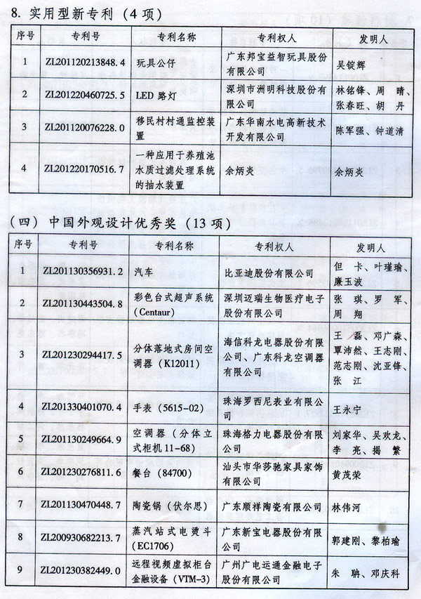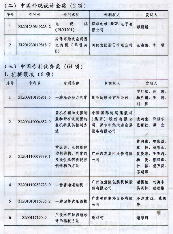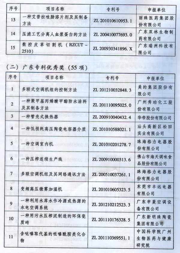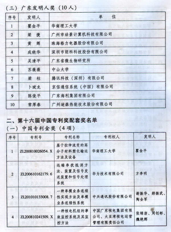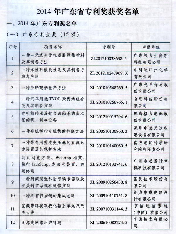 ? 廣東省人民政府關(guān)于表彰2014年廣東省 專利獎(jiǎng)單位和個(gè)人的通報(bào) ? 各地級以上市人民政府,各縣(市、區(qū))人民政府,省政府各部門、各直屬機(jī)構(gòu): 根據(jù)《廣東省專利獎(jiǎng)勵(lì)辦法》(粵府令第202號規(guī)定),經(jīng)廣東專利獎(jiǎng)評審委員會(huì)評審,省知識產(chǎn)權(quán)局審核,省政府決定授予“一種一元或多元?dú)饽z隔熱材料及其制備方法”等15項(xiàng)專利為2014年廣東專利金獎(jiǎng),給予每項(xiàng)10萬元的獎(jiǎng)勵(lì);授予“多聯(lián)式空調(diào)機(jī)組的控制方法”等55項(xiàng)專利為2014年廣東專利優(yōu)秀獎(jiǎng),給予每項(xiàng)5萬元的獎(jiǎng)勵(lì);授予瞿金平等10位發(fā)明人2014年廣東發(fā)明人獎(jiǎng),給予每人2萬元的獎(jiǎng)勵(lì);對我省獲得第十六屆中國專利金獎(jiǎng)的“基于拉伸流變的高分子材料塑化輸運(yùn)方法及設(shè)備”等4項(xiàng)專利、獲得第十六屆中國外觀設(shè)計(jì)金獎(jiǎng)的“電視機(jī)(PLY1201)”等2項(xiàng)專利給予每項(xiàng)100萬元獎(jiǎng)勵(lì),對我省獲得第十六屆中國專利優(yōu)秀獎(jiǎng)的“一種混合動(dòng)力汽車”等64項(xiàng)專利、獲得第十六屆中國外觀設(shè)計(jì)優(yōu)秀獎(jiǎng)的“汽車”等13項(xiàng)專利給予每項(xiàng)50萬元獎(jiǎng)勵(lì)。