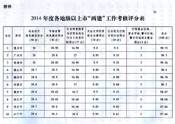 按照省委、省政府關(guān)于加強(qiáng)社會信用體系建設(shè)和市場監(jiān)管體系建設(shè)(以下簡稱“兩建”)工作部署和《2014年度廣東省社會信用體系建設(shè)和市場監(jiān)管體系建設(shè)工作考核方案》要求,省“兩建”工作領(lǐng)導(dǎo)小組辦公室牽頭組織省有關(guān)單位對各地級以上市政府“兩建”工作進(jìn)行了考核。經(jīng)綜合評定,21個地級以上市考核全部合格,其中,惠州、廣州、珠海市成績顯著。經(jīng)省人民政府同意,現(xiàn)將全省“兩建”工作情況通報如下: