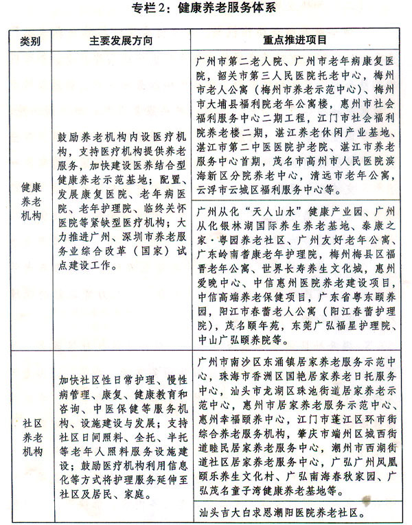 (二)加快發(fā)展健康養(yǎng)老服務(wù)。 7.健全醫(yī)養(yǎng)結(jié)合協(xié)作機(jī)制。建立健全醫(yī)療機(jī)構(gòu)與養(yǎng)老機(jī)構(gòu)業(yè)務(wù)協(xié)作機(jī)制,支持養(yǎng)老機(jī)構(gòu)內(nèi)設(shè)醫(yī)療機(jī)構(gòu)或構(gòu)建養(yǎng)老、護(hù)理機(jī)構(gòu)相結(jié)合的醫(yī)養(yǎng)綜合體,符合規(guī)定的納入醫(yī)保定點(diǎn)。鼓勵(lì)以城市二級(jí)醫(yī)院轉(zhuǎn)型等多種方式,配置、發(fā)展康復(fù)醫(yī)院、老年病醫(yī)院、老年護(hù)理院等緊缺型醫(yī)療機(jī)構(gòu),形成規(guī)模適宜、功能互補(bǔ)、安全便捷的健康養(yǎng)老服務(wù)網(wǎng)絡(luò),提供方便快捷、優(yōu)先優(yōu)惠的老年醫(yī)療服務(wù)。支持公立醫(yī)院以及社區(qū)醫(yī)療機(jī)構(gòu)設(shè)置老年人醫(yī)療康復(fù)護(hù)理專(zhuān)業(yè)科室,大幅提高二級(jí)以上綜合醫(yī)院開(kāi)設(shè)老年病科的比例,著力增強(qiáng)醫(yī)養(yǎng)結(jié)合的養(yǎng)老服務(wù)能力。大力推進(jìn)廣州、深圳市養(yǎng)老服務(wù)業(yè)綜合改革(國(guó)家)試點(diǎn),加快建設(shè)醫(yī)養(yǎng)結(jié)合型健康養(yǎng)老示范基地。(省民政廳、衛(wèi)生計(jì)生委負(fù)責(zé),省人力資源社會(huì)保障廳、中醫(yī)藥局參與)