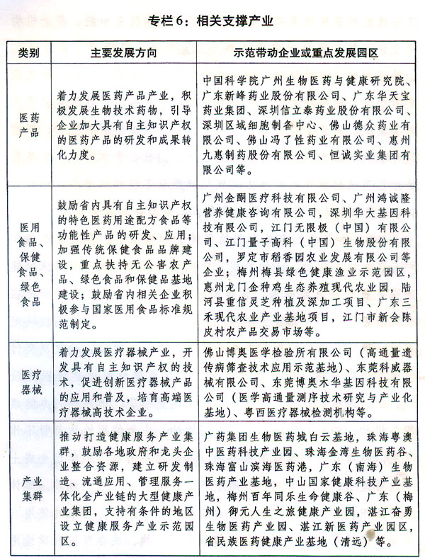 (六)培育發(fā)展健康服務(wù)業(yè)相關(guān)支撐產(chǎn)業(yè)。 18.重點(diǎn)推進(jìn)醫(yī)藥產(chǎn)業(yè)研發(fā)和應(yīng)用。著力發(fā)展醫(yī)藥和醫(yī)療器械產(chǎn)業(yè),引導(dǎo)企業(yè)加大具有自主知識(shí)產(chǎn)權(quán)的新藥和醫(yī)療器械新產(chǎn)品的研發(fā)和成果轉(zhuǎn)化力度,提升企業(yè)創(chuàng)新能力和核心競(jìng)爭(zhēng)力。以現(xiàn)代化中藥、生物醫(yī)藥、特色化學(xué)原料藥、藥物制劑、體外診斷試劑、高端醫(yī)療器械、康復(fù)輔助器具和新型智能康復(fù)系統(tǒng)與設(shè)備及關(guān)鍵制藥裝備、健康穿戴裝備等為重點(diǎn),開(kāi)發(fā)具有自主知識(shí)產(chǎn)權(quán)的產(chǎn)品和技術(shù)。強(qiáng)化先進(jìn)醫(yī)療技術(shù)發(fā)明應(yīng)用推廣,加快實(shí)施廣東創(chuàng)新醫(yī)療器械產(chǎn)品應(yīng)用示范工程,促進(jìn)創(chuàng)新醫(yī)療器械產(chǎn)品的應(yīng)用和普及,培育一批擁有自主知識(shí)產(chǎn)權(quán)和核心競(jìng)爭(zhēng)力的高端醫(yī)療器械高新技術(shù)企業(yè)。(省科技廳、食品藥品監(jiān)管局、經(jīng)濟(jì)和信息化委負(fù)責(zé),省衛(wèi)生計(jì)生委、發(fā)展改革委參與)