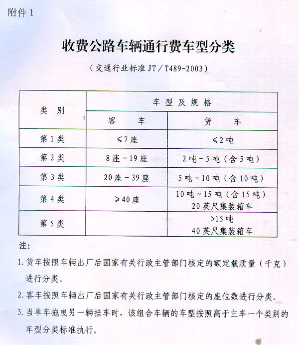 粵交費(fèi)〔2015〕1206號(hào)請(qǐng)示收悉。同意連平(贛粵界)至從化公路建成通車(chē)和收費(fèi)站收費(fèi)設(shè)施經(jīng)驗(yàn)收符合省聯(lián)網(wǎng)收費(fèi)技術(shù)要求后開(kāi)始收費(fèi),收費(fèi)車(chē)型按國(guó)家統(tǒng)一標(biāo)準(zhǔn)進(jìn)行分類(lèi),一至五類(lèi)車(chē)的收費(fèi)系數(shù)分別為1、1.5、2、3、3.5,收費(fèi)標(biāo)準(zhǔn)為0.6元/標(biāo)準(zhǔn)車(chē)公里;貨車(chē)實(shí)行完全計(jì)重收費(fèi),基本費(fèi)率為0.12元/噸·公里。