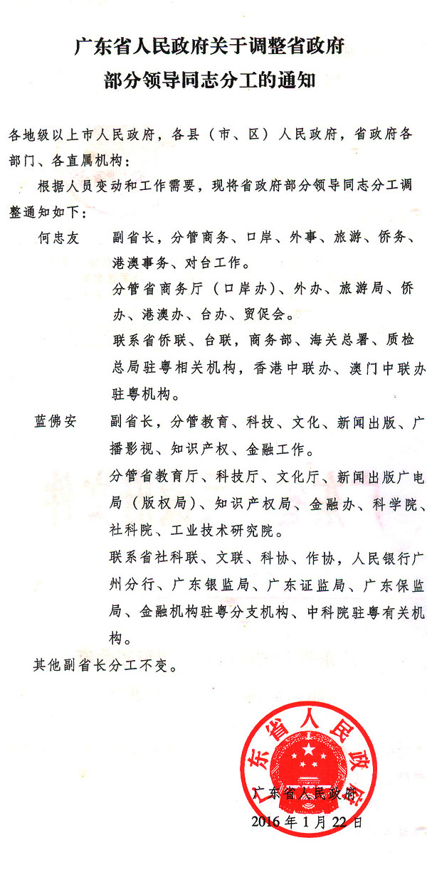 名稱: | 廣東省人民政府關(guān)于調(diào)整省政府部分領(lǐng)導(dǎo)同志分工的通知 | ||