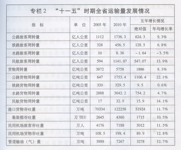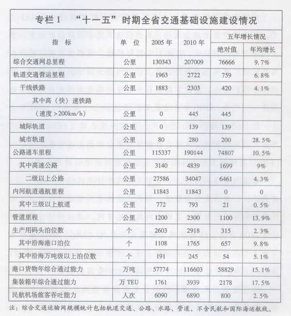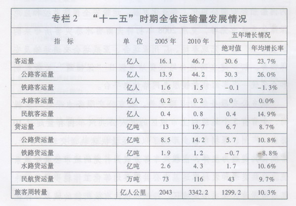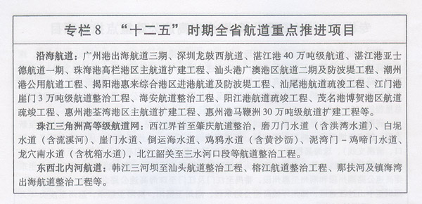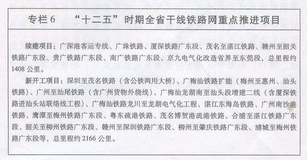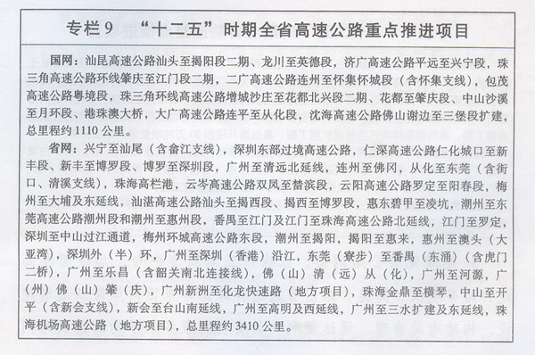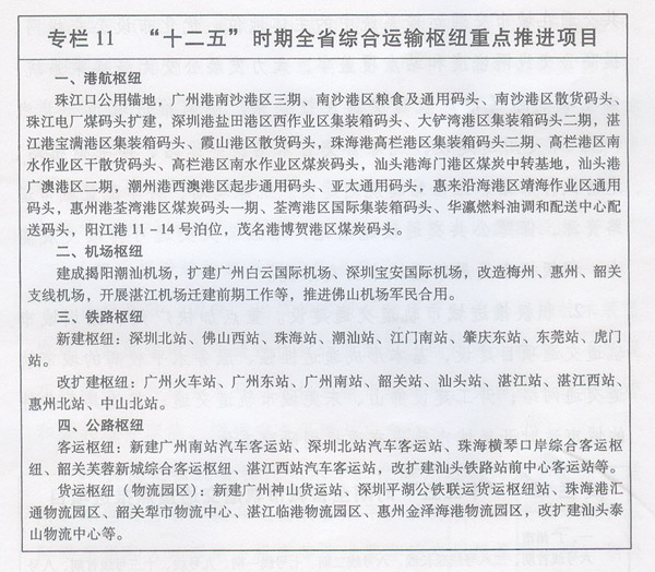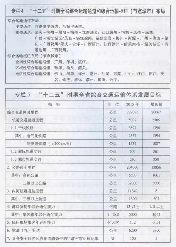 廣東省人民政府辦公廳關(guān)于印發(fā)廣東省 綜合交通運(yùn)輸體系發(fā)展“十二五”規(guī)劃的通知 ? 各地級(jí)以上市人民政府,各縣(市、區(qū))人民政府,省政府各部門、各直屬機(jī)構(gòu): 《廣東省綜合交通運(yùn)輸體系發(fā)展“十二五”規(guī)劃》已經(jīng)省人民政府同意,現(xiàn)印發(fā)給你們,請(qǐng)認(rèn)真組織實(shí)施。實(shí)施中遇到的問(wèn)題,請(qǐng)徑向省發(fā)展改革委、交通運(yùn)輸廳反映。 ? ? ? ? 廣東省人民政府辦公廳 2012年9月29日 ? ? ? ? 廣東省綜合交通運(yùn)輸體系 發(fā)展“十二五”規(guī)劃 ? 目 錄 ? 一、發(fā)展基礎(chǔ)………………………………………………………………………(1) (一)主要成就……………………………………………………………………(1) ?。ǘ┐嬖趩?wèn)題……………………………………………………………………(8) ?。ㄈ┌l(fā)展要求……………………………………………………………………(9) 二、指導(dǎo)思想和發(fā)展目標(biāo)………………………………………………………(11) (一)指導(dǎo)思想……………………………………………………………………(11) ?。ǘ┌l(fā)展原則……………………………………………………………………(11) (三)發(fā)展目標(biāo)……………………………………………………………………(12) 三、主要任務(wù)………………………………………………………………………(15) ?。ㄒ唬┘涌旖煌ㄟ\(yùn)輸線網(wǎng)建設(shè)……………………………………………………(15) (二)強(qiáng)化綜合運(yùn)輸樞紐建設(shè)……………………………………………………(19) ?。ㄈ┨岣叱鞘薪煌ūU夏芰Α?1) ?。ㄋ模┨嵘\(yùn)輸服務(wù)現(xiàn)代化水平…………………………………………………(23) ?。ㄎ澹┥罨w制機(jī)制改革…………………………………………………………(26) ?。┐龠M(jìn)交通運(yùn)輸業(yè)綠色發(fā)展…………………………………………………(27) ?。ㄆ撸┥罨瘏^(qū)域交通運(yùn)輸一體化合作……………………………………………(28) 四、保障措施………………………………………………………………………(30) ?。ㄒ唬┛茖W(xué)謀劃重大項(xiàng)目…………………………………………………………(30) (二)拓寬投融資渠道……………………………………………………………(30) ?。ㄈ┘訌?qiáng)規(guī)章制度建設(shè)…………………………………………………………(31) (四)健全行業(yè)標(biāo)準(zhǔn)體系…………………………………………………………(31) ? ? 交通運(yùn)輸是國(guó)民經(jīng)濟(jì)和社會(huì)發(fā)展的重要基礎(chǔ)。構(gòu)建便捷、安全、高效、綠色的綜合交通運(yùn)輸體系,是交通運(yùn)輸領(lǐng)域落實(shí)科學(xué)發(fā)展觀的重要舉措,對(duì)于促進(jìn)經(jīng)濟(jì)長(zhǎng)期平穩(wěn)較快發(fā)展、全面建設(shè)小康社會(huì)具有十分重要的意義。根據(jù)《廣東省國(guó)民經(jīng)濟(jì)和社會(huì)發(fā)展“十二五”規(guī)劃綱要》,制定《廣東省綜合交通運(yùn)輸體系發(fā)展“十二五”規(guī)劃》。 一、發(fā)展基礎(chǔ) (一)主要成就。 “十一五”時(shí)期全省各地按照省委、省政府的統(tǒng)一部署,采取一系列積極有效措施,加快推進(jìn)交通基礎(chǔ)設(shè)施建設(shè),努力提升運(yùn)輸能力和服務(wù)水平,取得了顯著成績(jī),初步形成了軌道交通、公路、水路、民航、管道等各種運(yùn)輸方式協(xié)同發(fā)展、有序銜接的綜合交通運(yùn)輸體系。 1.基礎(chǔ)設(shè)施建設(shè)步伐加快。 軌道交通實(shí)現(xiàn)跨越發(fā)展。全省軌道交通建設(shè)累計(jì)完成投資約2459億元。至2010年年底,全省軌道交通營(yíng)運(yùn)里程達(dá)2722公里,新增營(yíng)運(yùn)里程759公里。其中鐵路營(yíng)運(yùn)里程達(dá)2303公里,新增營(yíng)運(yùn)里程420公里,在建鐵路里程1303公里;城際軌道交通營(yíng)運(yùn)里程達(dá)139公里,在建城際軌道交通里程278公里;城市軌道交通營(yíng)運(yùn)里程達(dá)280公里,新增營(yíng)運(yùn)里程200公里,在建里程約140公里。建成武廣客運(yùn)專線、洛湛鐵路粵境段等鐵路項(xiàng)目,開工建設(shè)貴廣、南廣、廈深、廣珠、韶贛等鐵路項(xiàng)目;建成廣佛城際首通段、廣珠城際廣州南站至珠海北站段等城際軌道交通項(xiàng)目,開工建設(shè)穗莞深、莞惠、佛肇等城際軌道交通項(xiàng)目;廣州城市軌道交通網(wǎng)絡(luò)骨架初步形成,深圳城市軌道交通建設(shè)加快,佛山、東莞城市軌道交通前期工作扎實(shí)推進(jìn)。 公路網(wǎng)絡(luò)日趨完善。全省公路建設(shè)累計(jì)完成投資約2438億元。至2010年底,全省公路通車總里程約達(dá)19萬(wàn)公里,其中高速公路約4839公里,全省基本形成以珠江三角洲核心區(qū)為中心、直達(dá)東西北、聯(lián)通港澳、輻射泛珠江三角洲地區(qū)的高速公路網(wǎng)絡(luò),實(shí)現(xiàn)與陸路相鄰省(區(qū),澳門除外)均有兩條以上高速公路出省通道。全省公路網(wǎng)絡(luò)通行能力和通達(dá)深度進(jìn)一步提升,國(guó)道基本實(shí)現(xiàn)高等級(jí)化,鎮(zhèn)通建制村公路路面硬化任務(wù)于2009年底