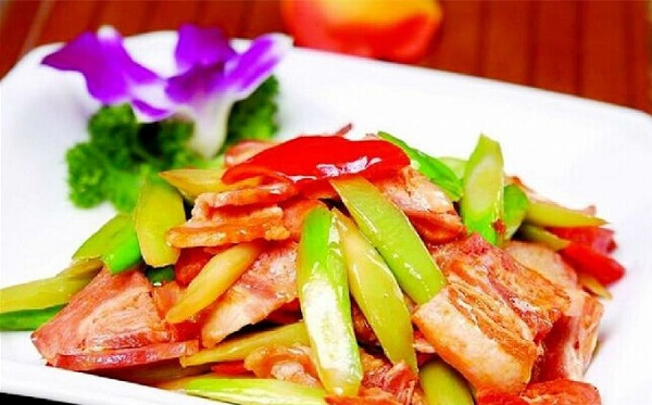 5、蒜瓣爆香,加煙熏肉炒至煙熏肉脆;