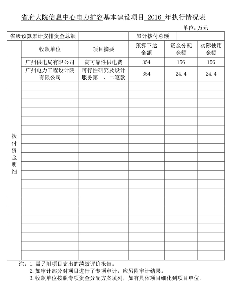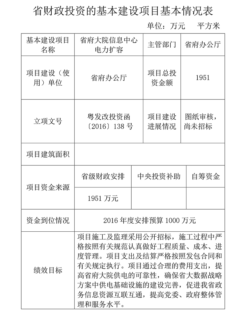 省府大院信息中心電力擴容項目由我廳于2015年1月向省發(fā)展改革委申請立項(粵辦函〔2015〕1號),今年1月省發(fā)展改革委粵發(fā)改投資函〔2016〕138號文批復我廳同意項目立項,今年3月你廳粵財建〔2016〕27號文批復該項目2016年度預算資金1000萬元。