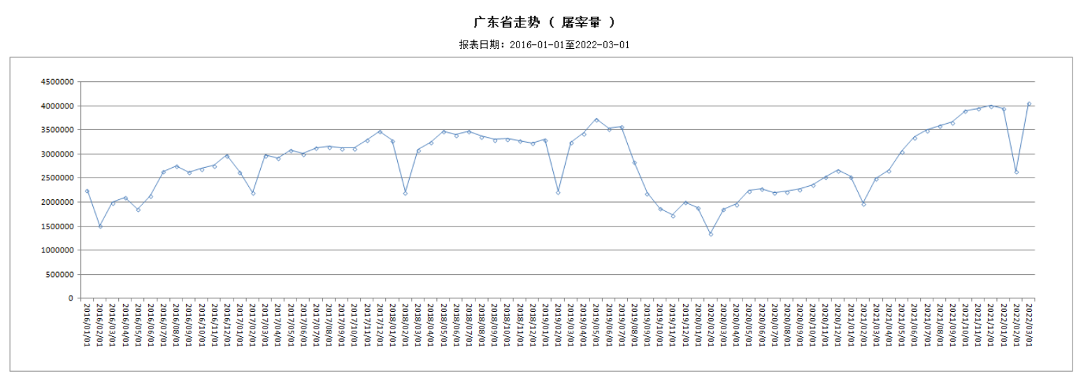 對(duì)全省316家生豬定點(diǎn)屠宰企業(yè)跟蹤監(jiān)測(cè),3月份共屠宰生豬4060841頭,比2月份上升53.83%。