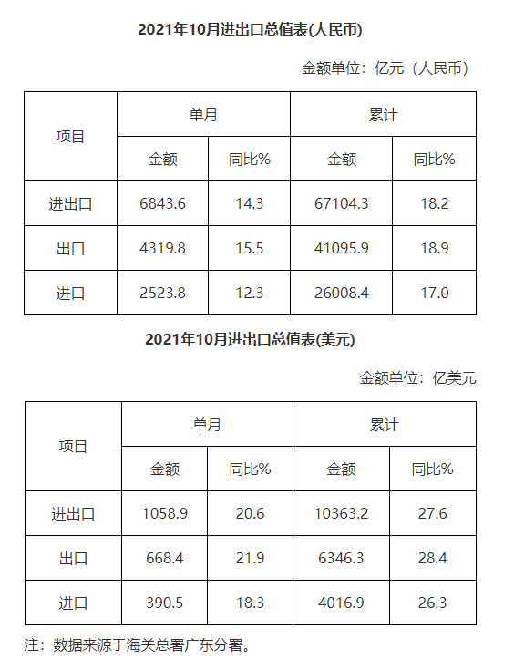 廣東省外貿(mào)進(jìn)出口總值表(2021年10月)