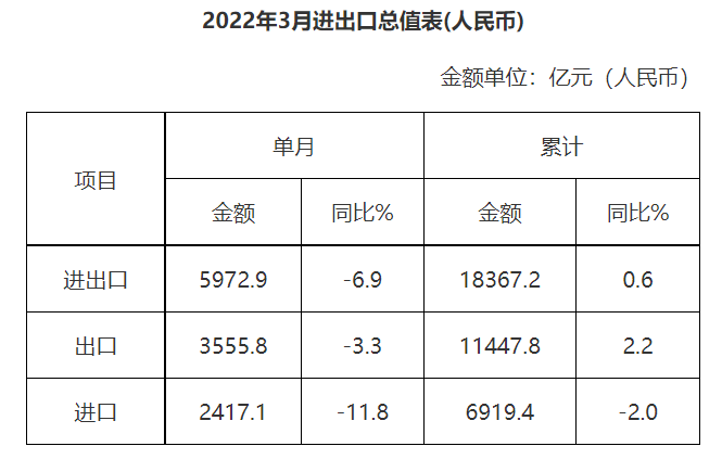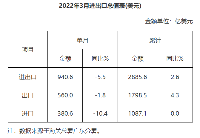 廣東省外貿(mào)進(jìn)出口總值表(2022年3月)